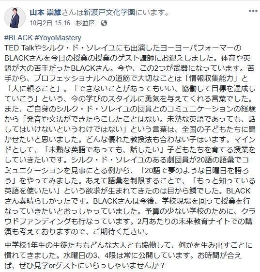 また、この授業を担当されている山本先生が、今回の授業の感想をfacebookへ投稿してくださっていました。