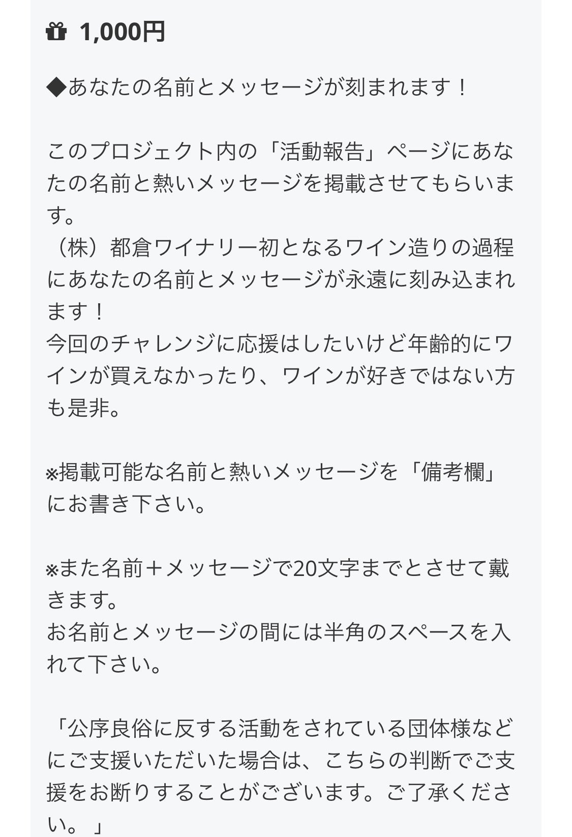 『◆あなたの名前とメッセージが刻まれます! 』のリターンを選んで下さった皆様本当に有難うございました。この挑戦をする上で最初は不安や心配がつきませんでしたが、皆さんのご支援や応援によって凄く励まされ、素晴らしい挑戦ができた事に感謝の気持ちでいっぱいです!この活動報告の投稿にて支援者からのメッセージと、名前を掲載させてもらい『◆あなたの名前とメッセージが刻まれます!』のリターンへと変えさせて頂きます。(※名前だけの方、メッセージだけの方はそのまま書かせてもらいます)~~~~~~~~~~~~~~~~~~~~~~~~~~~~~~~~・大泉洋 楽しみですレセプション呼んでね・どーんず いつも元気をありがとう!・ふるちゃん 北の大地から最高のワインを!・音楽室さくら咲la 優勝や都倉ワインで乾杯・中銭巧 人生初ワインいただきます!・文豪hiroki 次作も楽しみにしてます・ 高橋秀人・杉山晴香・ゆかりーcrz・AKEMI SHAKUDO・Yoshitaka Nakamura・Hiromi Nakamura・智寿子・KOJI ODA・小宮山“Ace“元隆・茉子・頑張れ都倉~~~~~~~~~~~~~~~~~~~~~~~~~~~~~~~~これからもワイン造りへの挑戦、また新たな挑戦をしていくので応援を引き続き宜しくお願いします!!!都倉賢