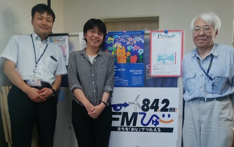 FMびゅーにて、市民活動の大先輩で老舗のお米やさん・白川晧一さん(右)と、社長の沼田勇也さん(左)と。