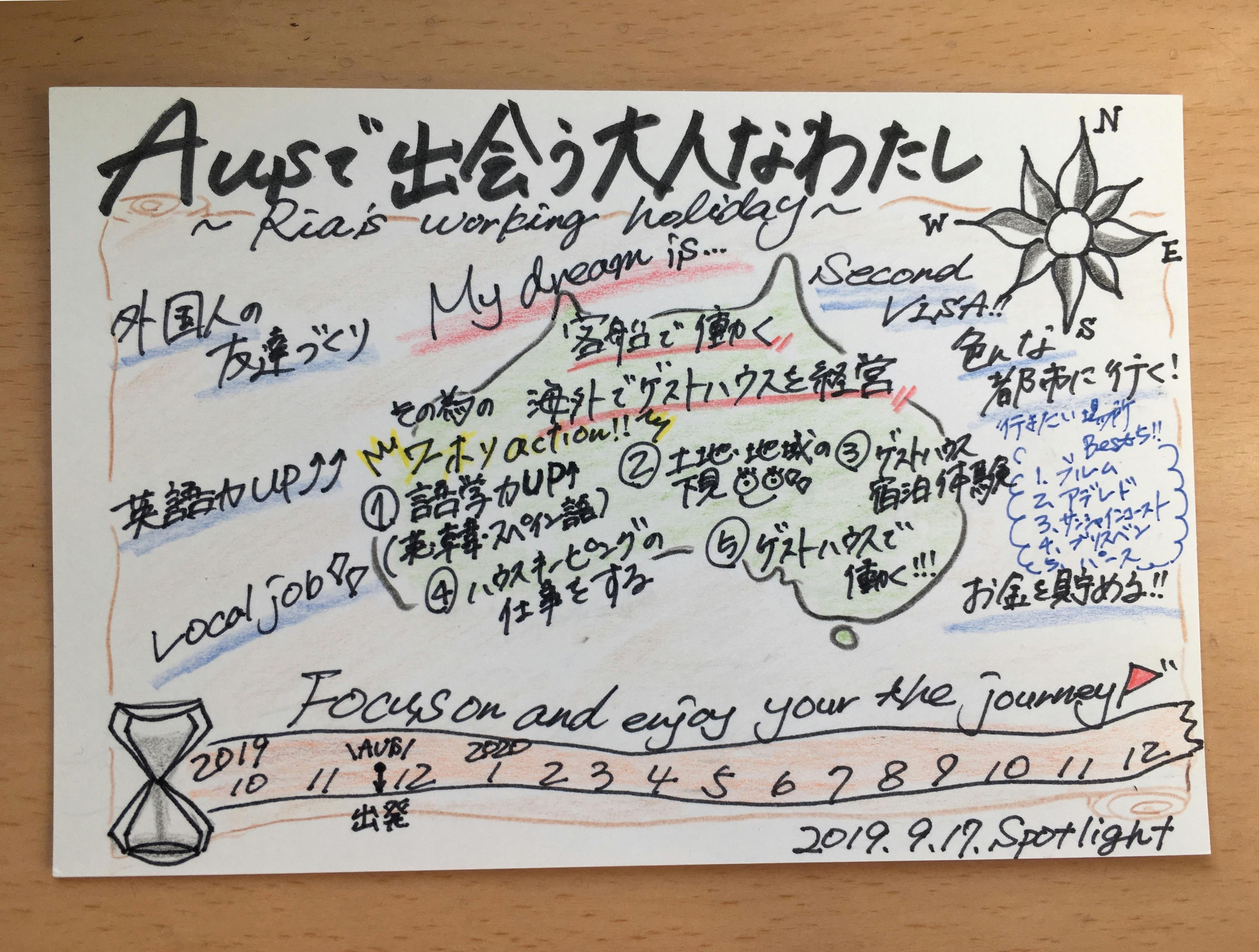 Australiaにいるワーホリ生が、ワーホリ後のビジョンを持ち、ワーホリをその先の未来に最大活用する為の自己実現サロン【Spotlight】(スポットライト)の設立をすること。