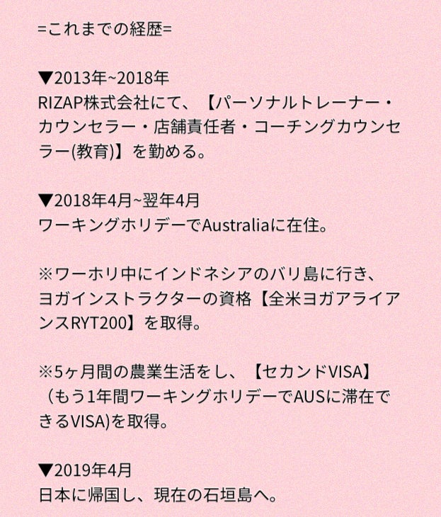 現在は、日本での英語環境を求め、沖縄県の石垣島にてリゾートバイト生活をしながら、2ヶ月半後のオーストラリア起業へ向けた、資金作り・準備をしています。