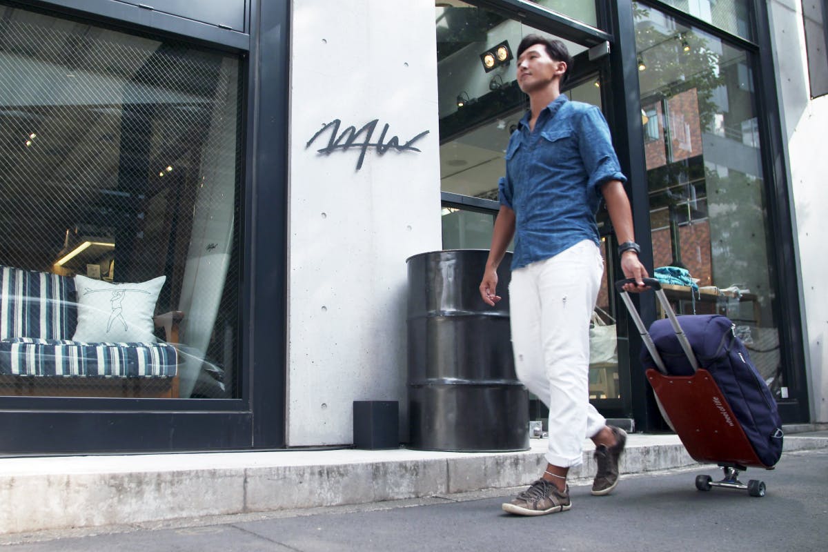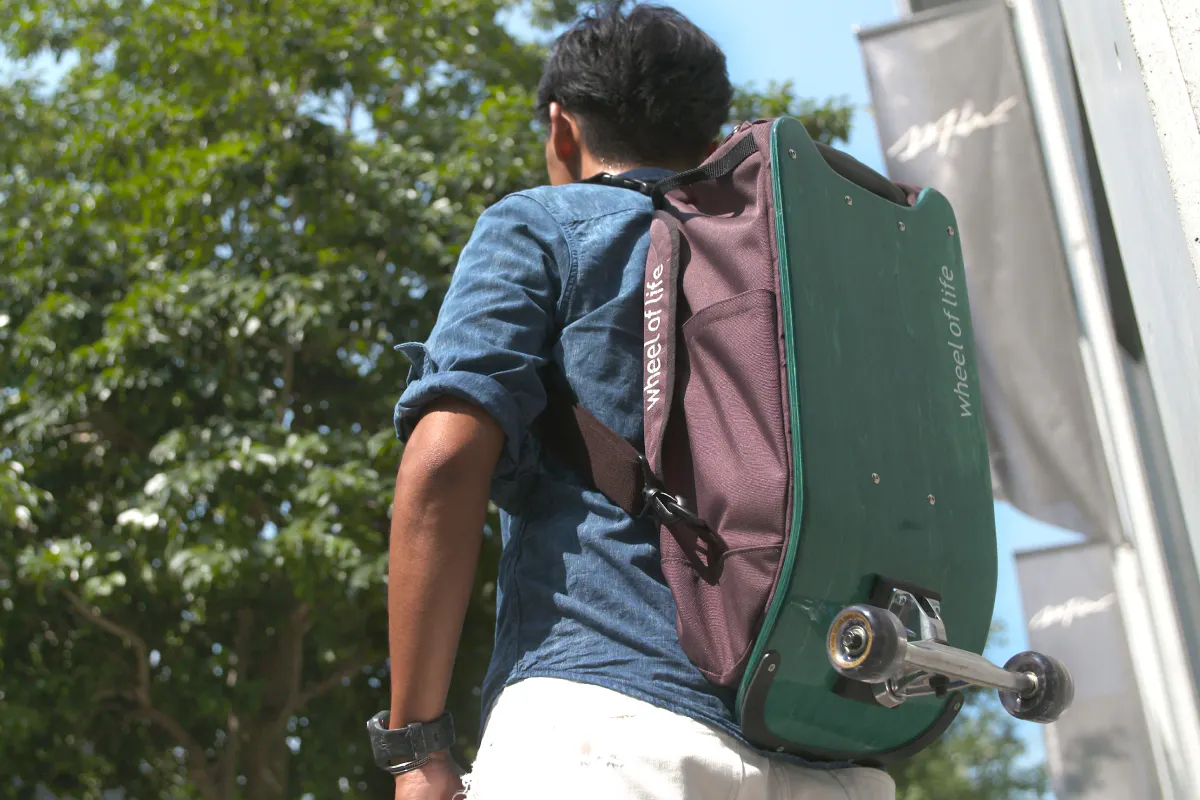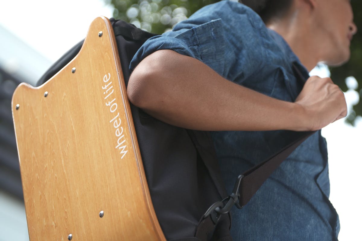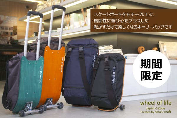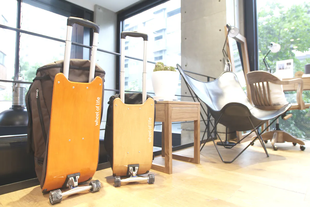デッキを使ってスケートボードをイメージしたキャリーバック。商品の名前はデッキキャリーです。移動も楽しくなるように機能性だけではなく、遊び心もいれたデザインを目指して、転がした人がクスって笑顔になれるよう作っています。