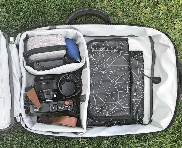 そして、クッション付き可動式間仕切りも付属。衣類から大切な一眼レフカメラまで収納でき、バッグの中で物が動かないように固定できます。なお、仕切りはマジックテープで自由に脱着・移設できるため、整理能力向上に役立ちます。