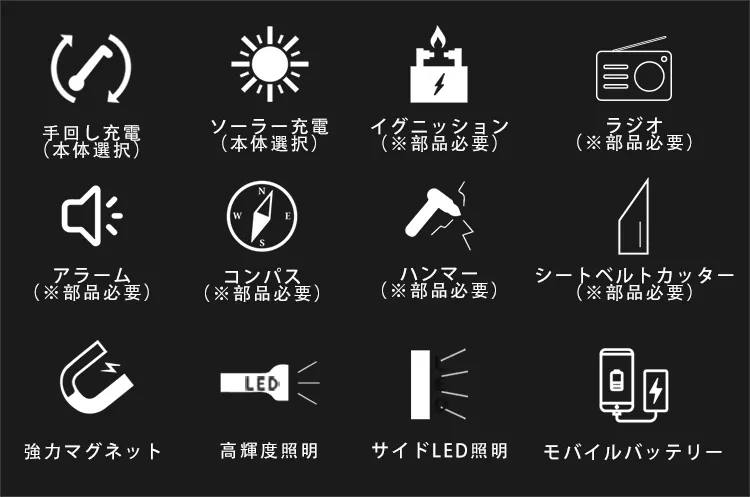 コンセントもない、悪天候で太陽もない、そんな時にも安心な「手回し充電」。本体側面についているハンドルを手で回すことによって電力を確保します。充電が無くなった場合でも、3分間手回しすることで約20分間使えます。万が一の時、命を救う命綱になります!