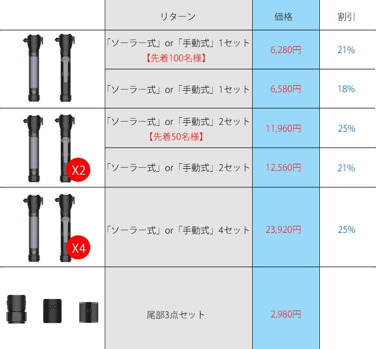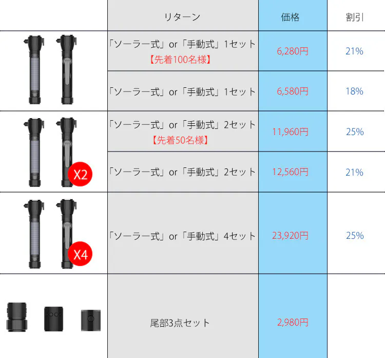 2020/01/06 15:42ご支援いただいた皆さま、こんにちは。雲集商事株式会社でございますこの度、災害時やアウトドア、手回し充電対応、多機能懐中電灯「HAMMER LIGHT」をご支援頂き、ありがとうございます。本プロジェクトリターン商品の発送は予定通り、今週中に皆様宛に行いますが『住所記載ミス』や『引っ越し』等で、商品戻りが発生しております。円滑の商品をお届けさせて頂きたいので今一度、配送先の住所確認のご協力をお願いします。お申し込み時にご指定いただいた配送先は、マイページよりご確認いただけます。変更があった場合は、マイページより住所変更の手続きをお願いします。今後ともをよろしくお願いいたします。 もっと見る【御礼】プロジェクト終了!と住所確認。