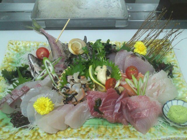 写真は自分が作った金目の煮付け、カサゴの煮付け、お刺身の盛り合わせ、刺身定食用、単品用の刺し盛です。仕入れ状況等で盛り付け飾り付けは変わります。