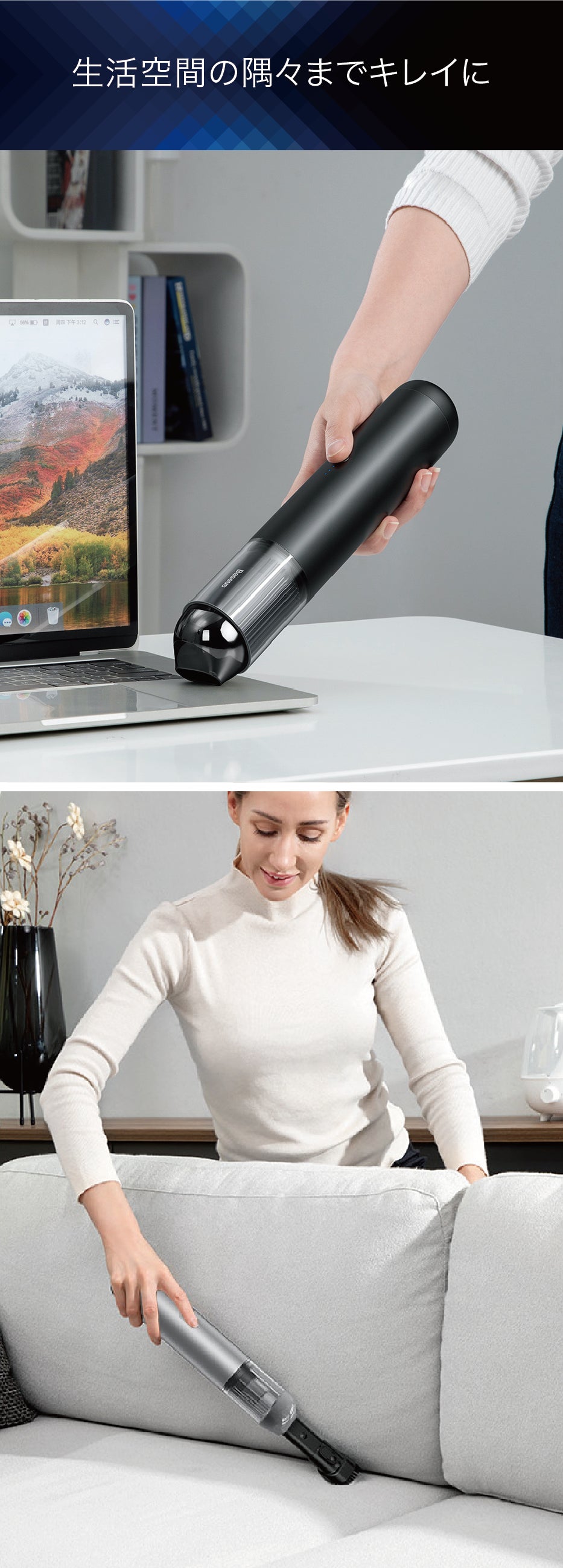 コードレスのハンディタイプなので、愛車や家の中などの細かな場所までお掃除がカンタン。気になったところをいつでもサッときれいに。特にカップホルダーやシートの縫い目、ウィンドウや通気口など、細かいホコリが溜まりやすい場所も、いつも清潔に保てます。