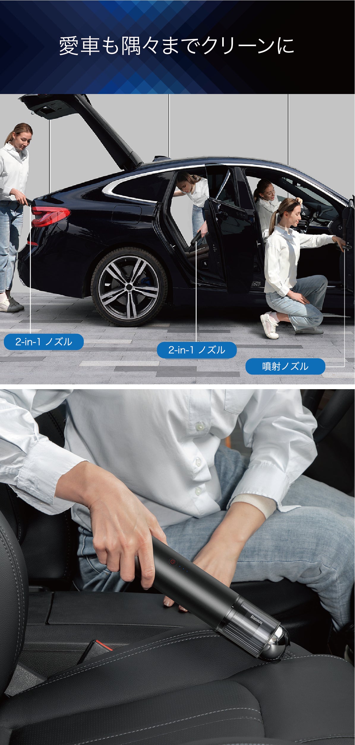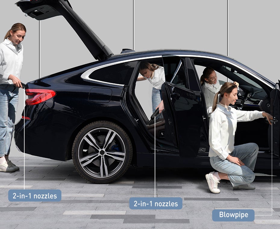 用途に合わせて3タイプのノズルを装着することで、フローリングのカドや狭い隙間などのゴミやホコリも除去できます。直に細部のゴミやホコリを吸い込みたい時はブラシなし、絨毯や車の吹出し口など柔らかくて凸凹のある場所にはブラシ付きに交換できる「2-in-1ノズル」。さらに細かい隙間のホコリを取るには「噴射ノズル」と、3種のノズル取り換えがワンタッチできますので、小さな隙間のホコリも残さずにお掃除できます。
