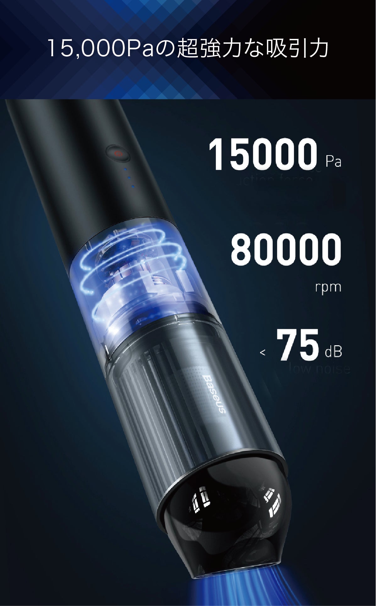 独自設計されたブラシレスモーターが80,000rpmで高速回転。コンパクトでありながら15,000Paもの超強力な吸引力で、パン屑や猫砂などの大きなゴミもパワフルに吸い上げます。そして強力な吸引力にもかかわらず、動作音は75dB以下と非常に静かです。