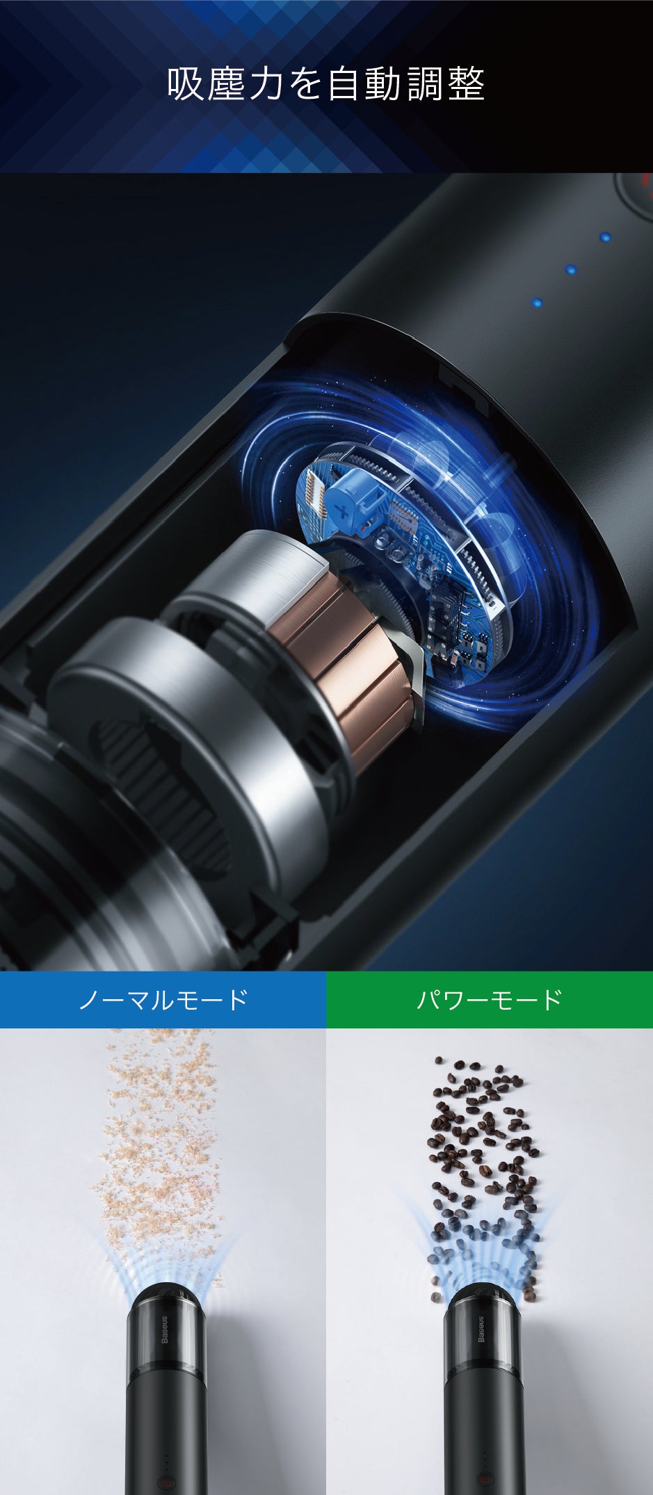 【カプセルクリーナーPremier】には空気の流れを感知するユニットが組み込まれています。大きなゴミに触れると吸塵力が「ノーマルモード」から「パワーモード」自動的に切り替わりますので、より簡単でスマートな掃除が可能になります。もちろん手動でもモードの切り替えができます。