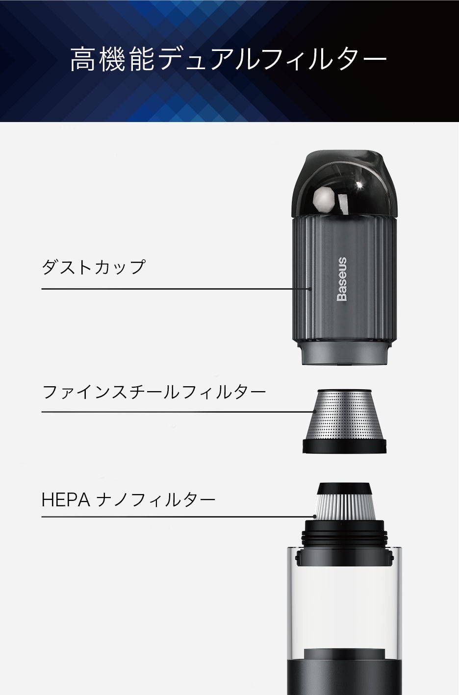 高密度ハニカム構造の「ファインスチールフィルター」と、クリーンルームに用いられるレベルの、0.3ミクロンの粒子の99.97%以上をキャッチする「HEPAナノフィルター」のデュアル構造により、あらゆる種類のホコリを除去します。
