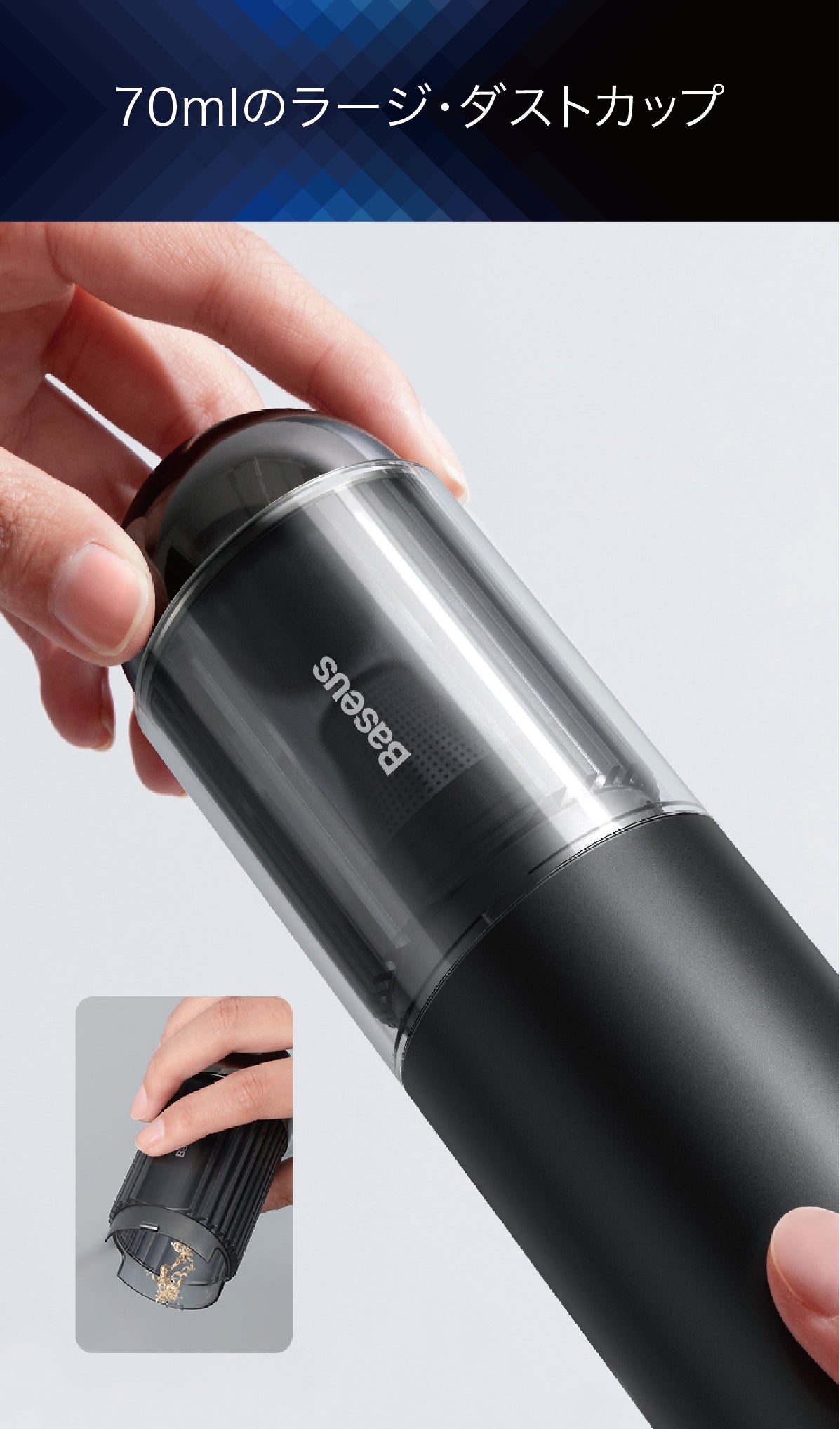 ゴミを何度も捨てる必要がないように、70mlのダストカップ容量を確保しました。デザインや機能性を損なうことなく設計され、容器の取り外しや掃除も簡単にできます。