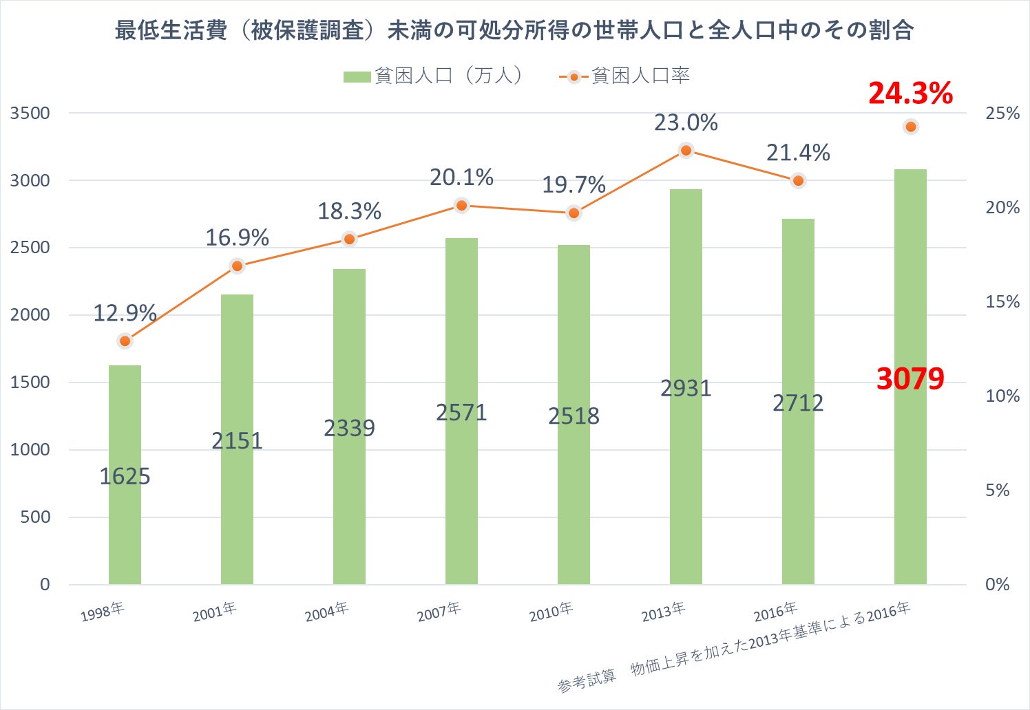 出典:福祉国家構想研究会blog(http://welfare.fem.jp/?p=77)。「国民生活基礎調査」各年データより作成(最低生活費は前年のもの)。直接の引用は、反貧困みやぎネットワークHP(http://hhmnet.wordpress.com/workingpoor/)より。 ※2013年から2016年にかけて貧困人口が減少しているのは、生活保護費の引き下げにより、基準となる最低生活費が低下したためです。2013年の最低生活費を基準に試算すると、貧困人口はむしろ増加しており、3000万人を超えています。