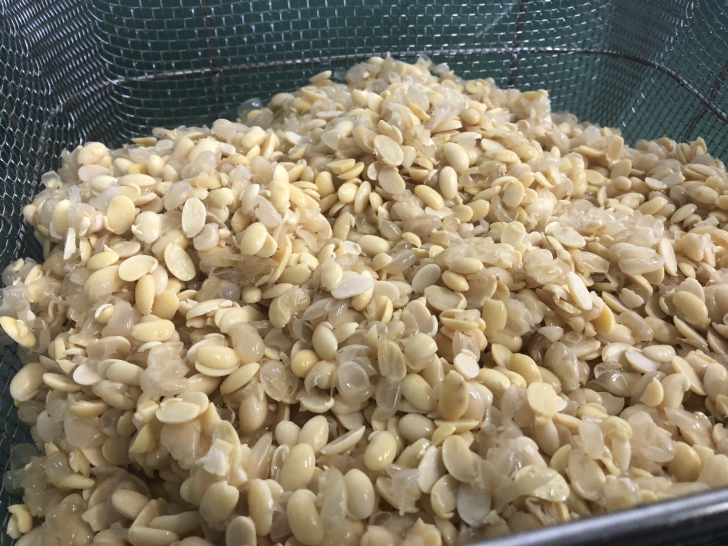 選別→浸水→茹で→浸水→皮むき→皮の分離→テンペ菌の付着→袋詰め→発酵