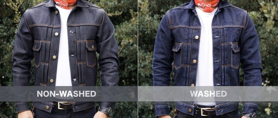 洗いをかけていないデニムジャケット、ジーンズになりますので、洗濯後の縮みが生じます。ウエスト・レングスは共に2-5cm程縮む事が予想されます。