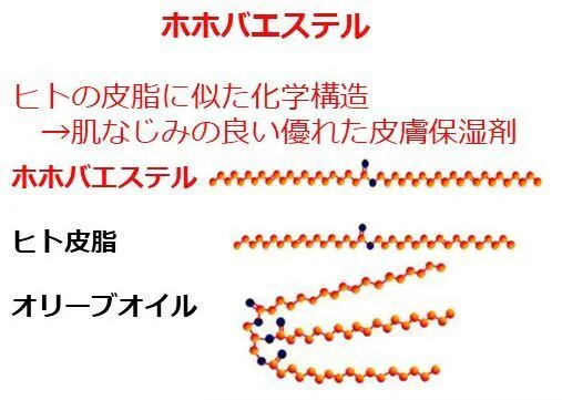 ホホバエステルは植物油で唯一、人の皮脂のワックス成分と構造的に似た液体状のワックスエステルです。