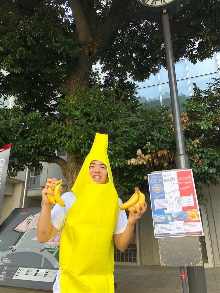 バナナのコスプレをして大学のキャンパスでバナナを配ったり、