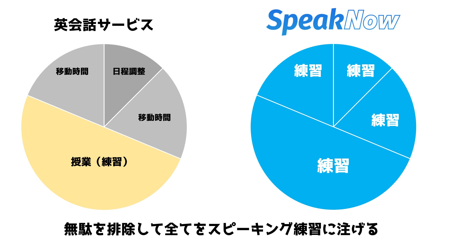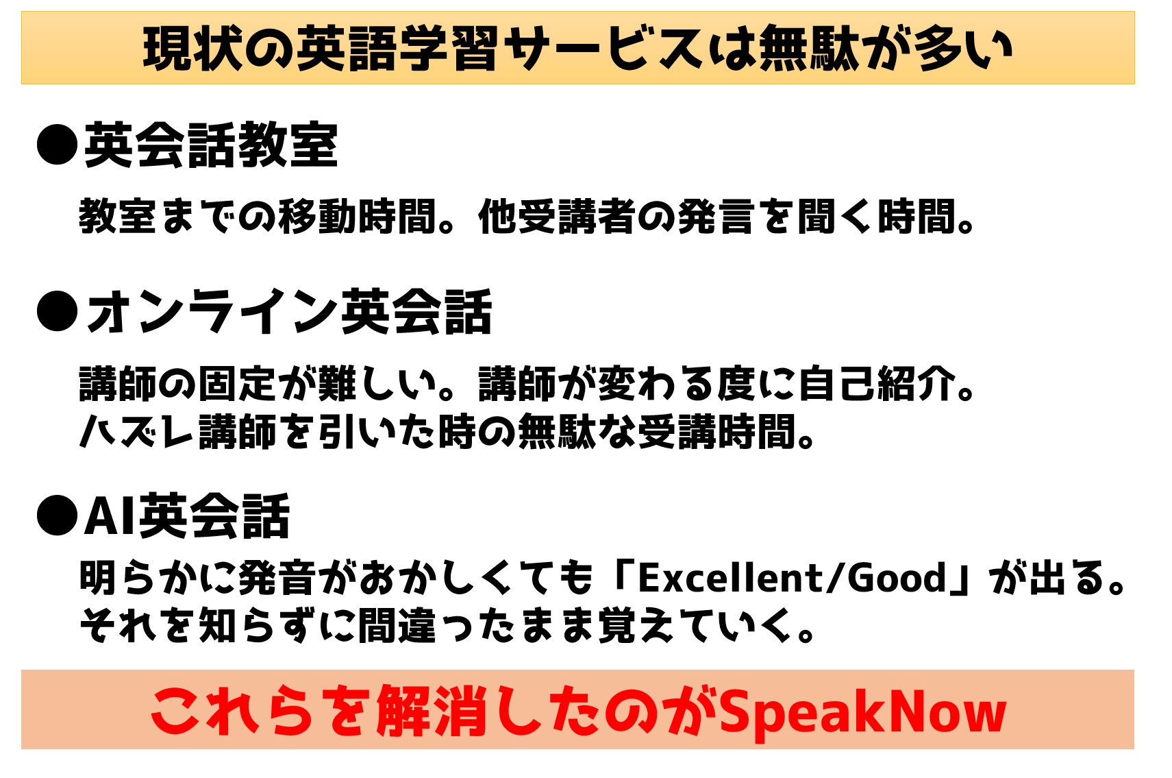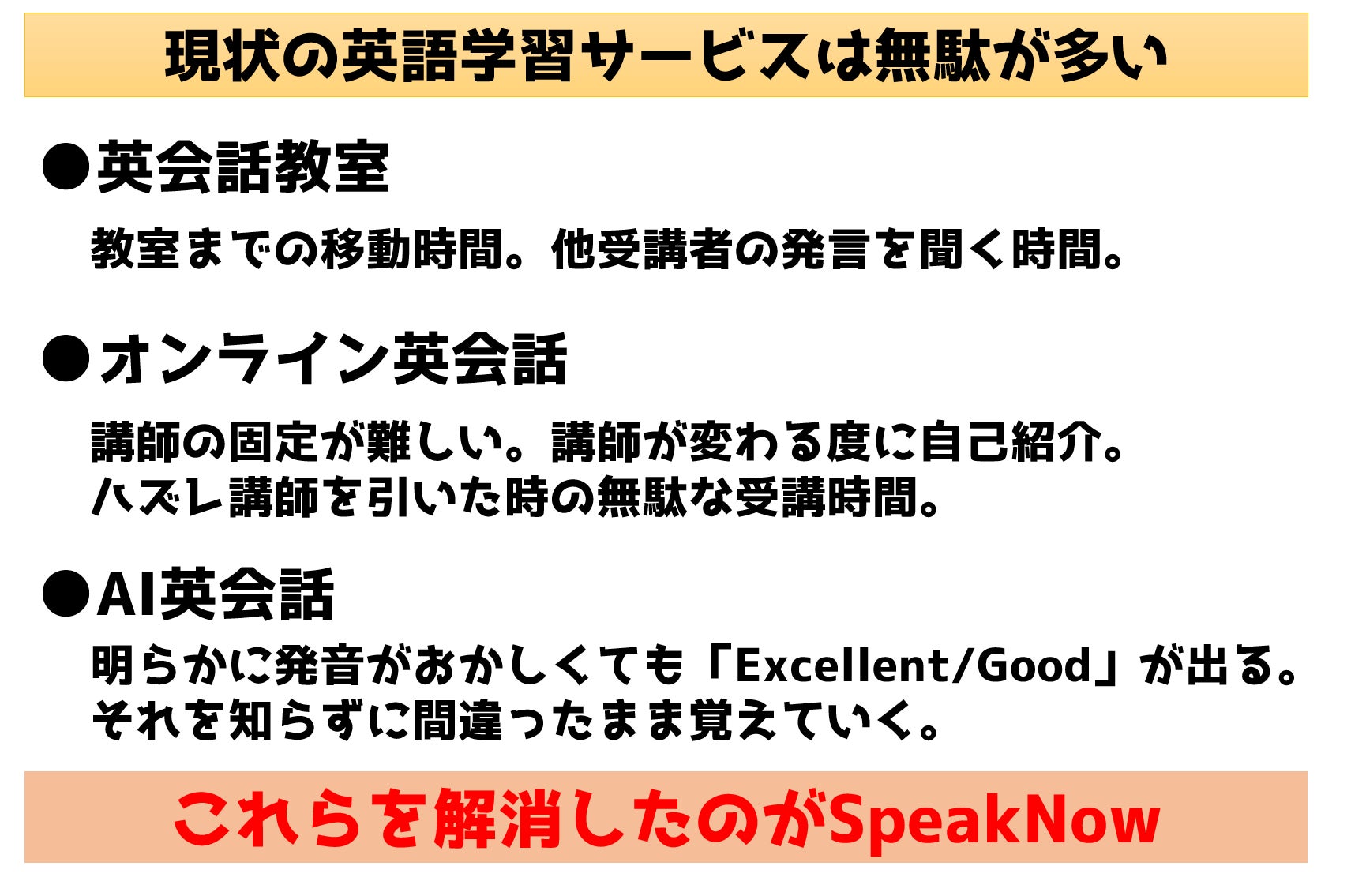 このように本来、英語学習にもっと多くの時間を割けるはずだったのに無駄と不都合により、その貴重な学習時間が奪われてしまっているのです。これらを解消したのがSpeakNowの学習法です。