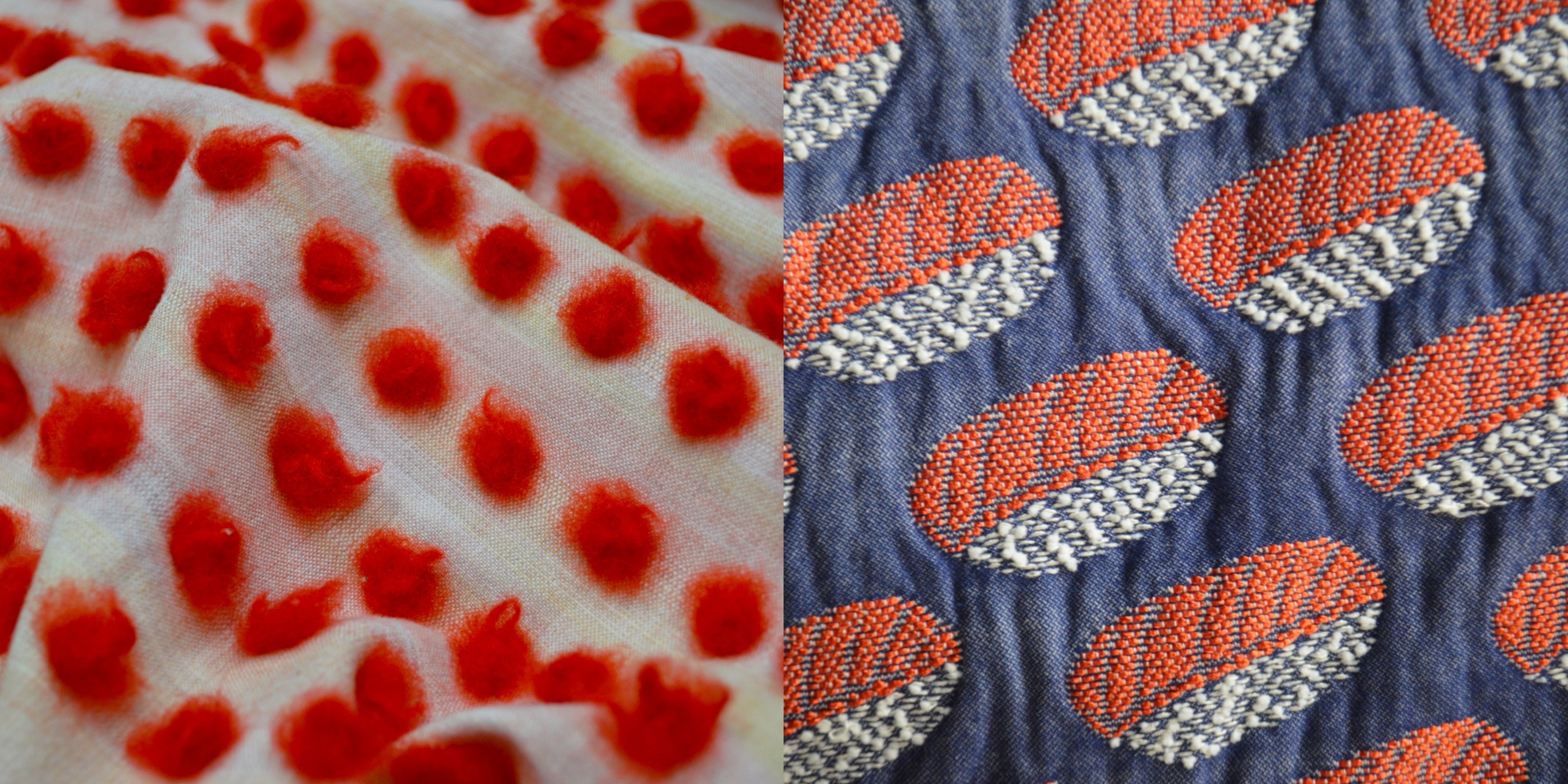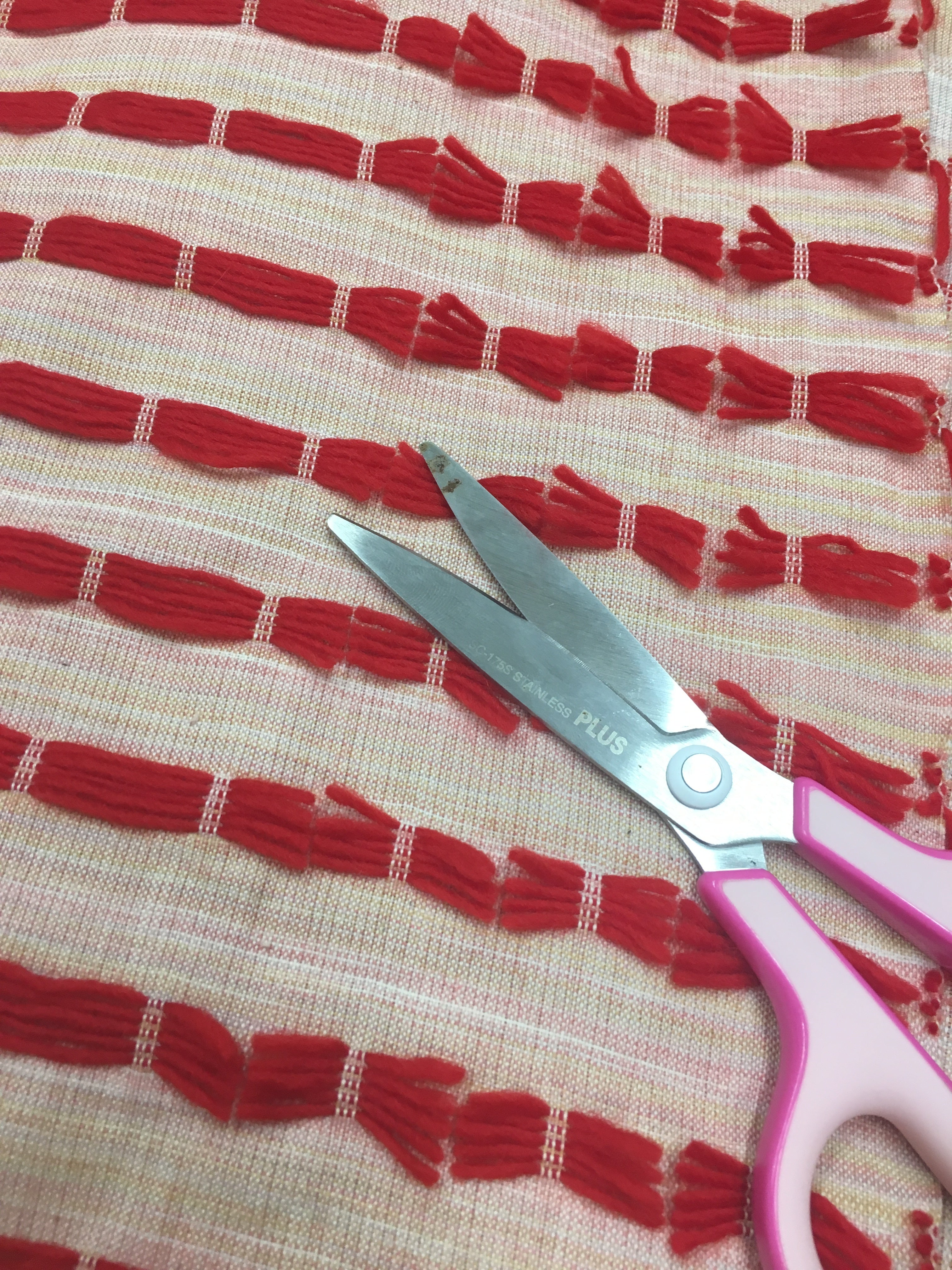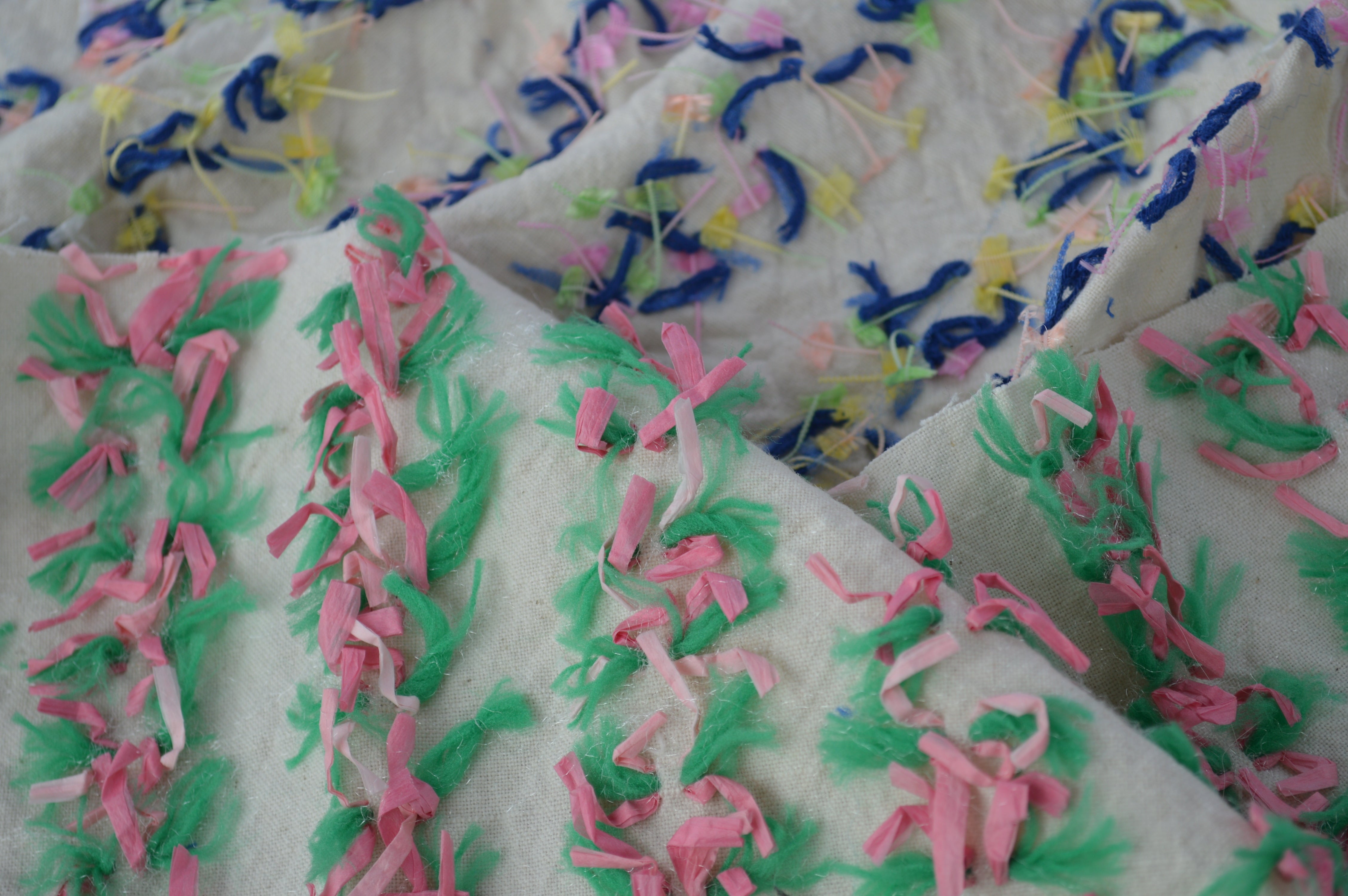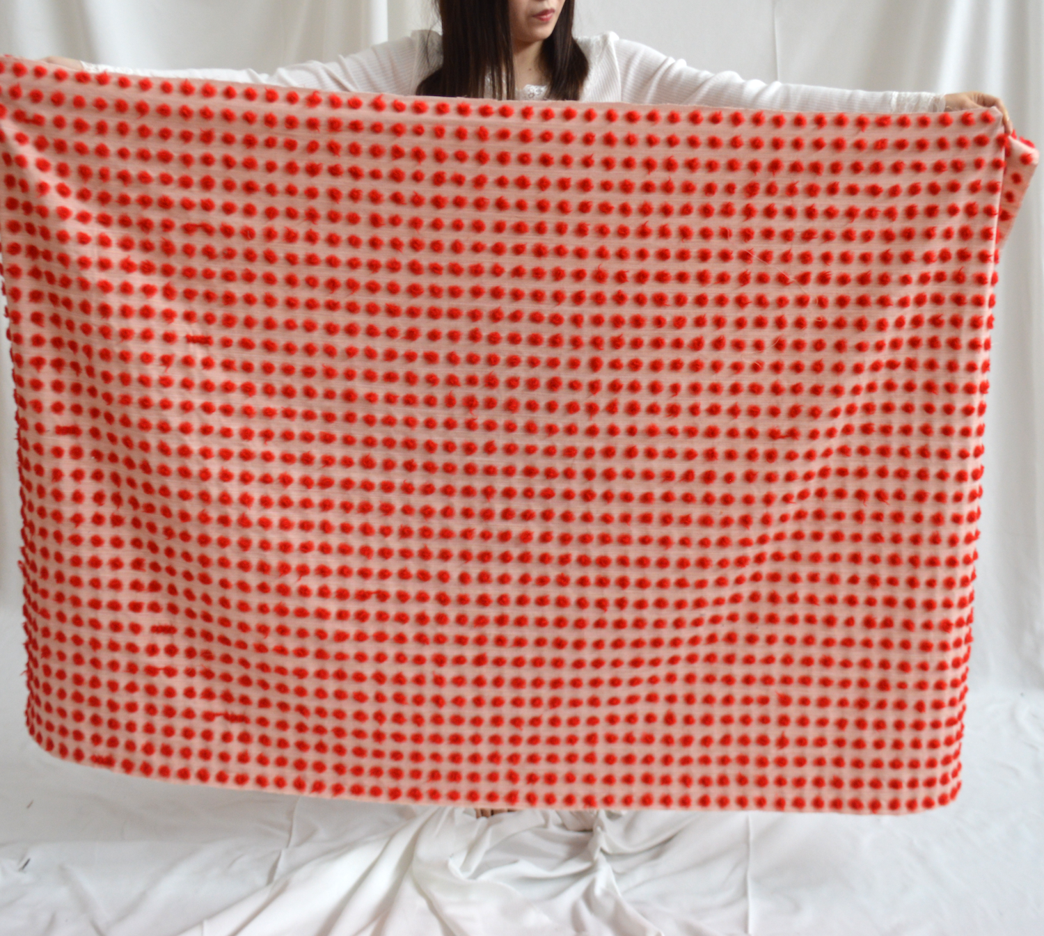この立体的な表現は「刺繍なの?」「あとでつけてるの?」とよく聞かれるのですがよこ糸をハサミで手作業で1つ1つカットして、そこから洗いにかけることで立体的にしています。20mを全てカットするのに3日間くらいかかる作業です。