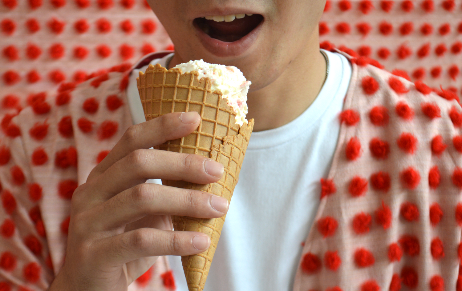 夏の暑い時期、こたつに入っているとき、暑い時も寒い時もアイスクリームは美味しいですよね。具がゴロゴロ入ったアイスなんてもう!子供も大人も好きなアイスクリームをポップなデザインで表現したいなあと思って制作しました。