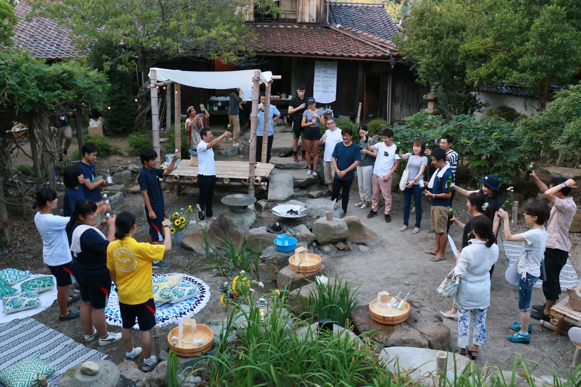 二年目となった2018年夏は、津和野のこれからを考える知の交流、交換が行われる「みんなの場」をつくりました。会場は、多胡家主屋及び庭園。普段は閉じているこの場所を公開し、高校生たちが竹でつくった舞台で納涼空間をつくり、みんなが邦楽や食を楽しめるパブリックな場づくりを行いました。