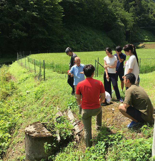 2017年8月 津和野スクールの「里山ワークショップ」の様子。農家の方から循環型の米づくりについて教えて頂く。