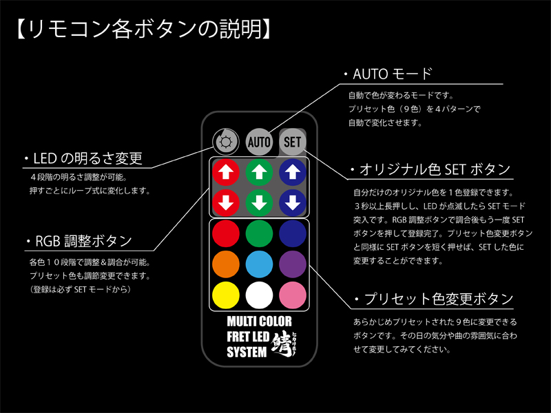 ・ネック側面のフレットポジションをLEDによって視認性を高めるアイテムです。付属の両面テープで張り付けるだけですので、お気に入りの愛機を簡単にLED化することが出来ます。