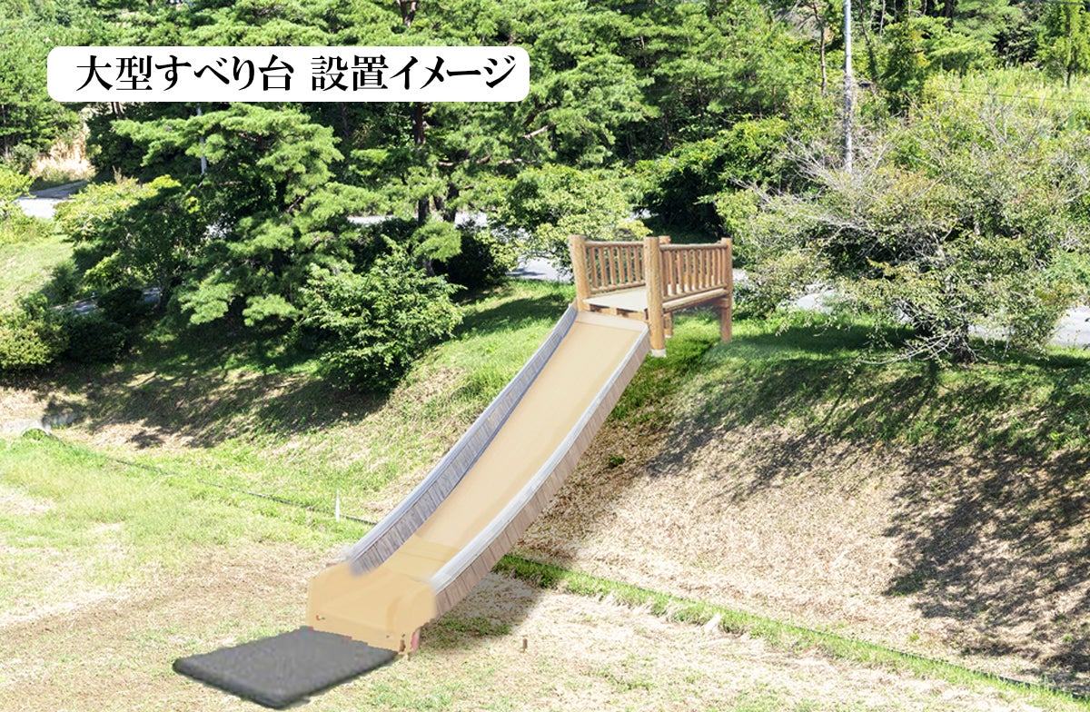 そこで、当法人が進めている「里山いちばん星」整備構想の一環として、いちばん星牧場(動物とのふれあい広場)わきにある草地に大型すべり台を設置し、自然物のぬくもりに触れる場の提供と東北産木材を可能な限り使用し、特に子供たちが里山の自然に触れながら外で遊ぶことの楽しさ・南相馬の里山への親近感を感じてもらえる環境をつくるプロジェクトを企画しました。