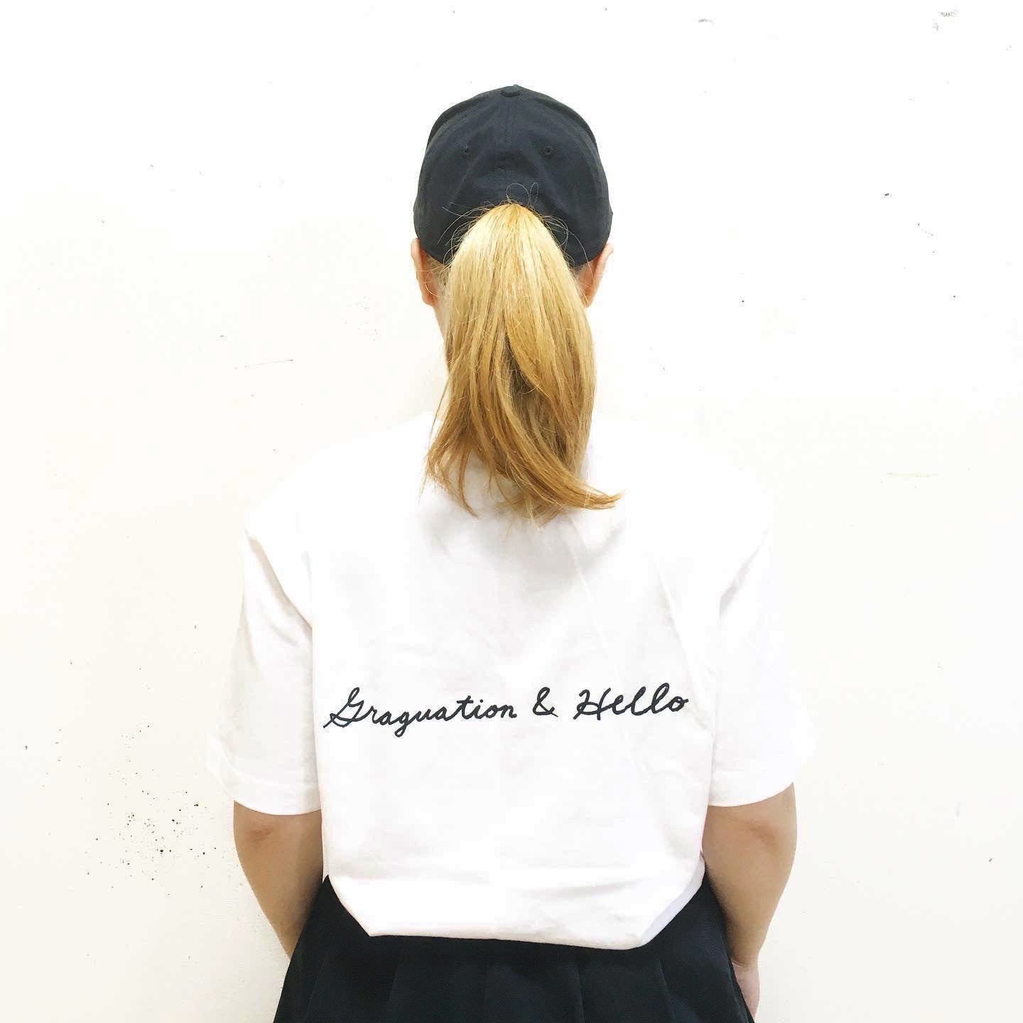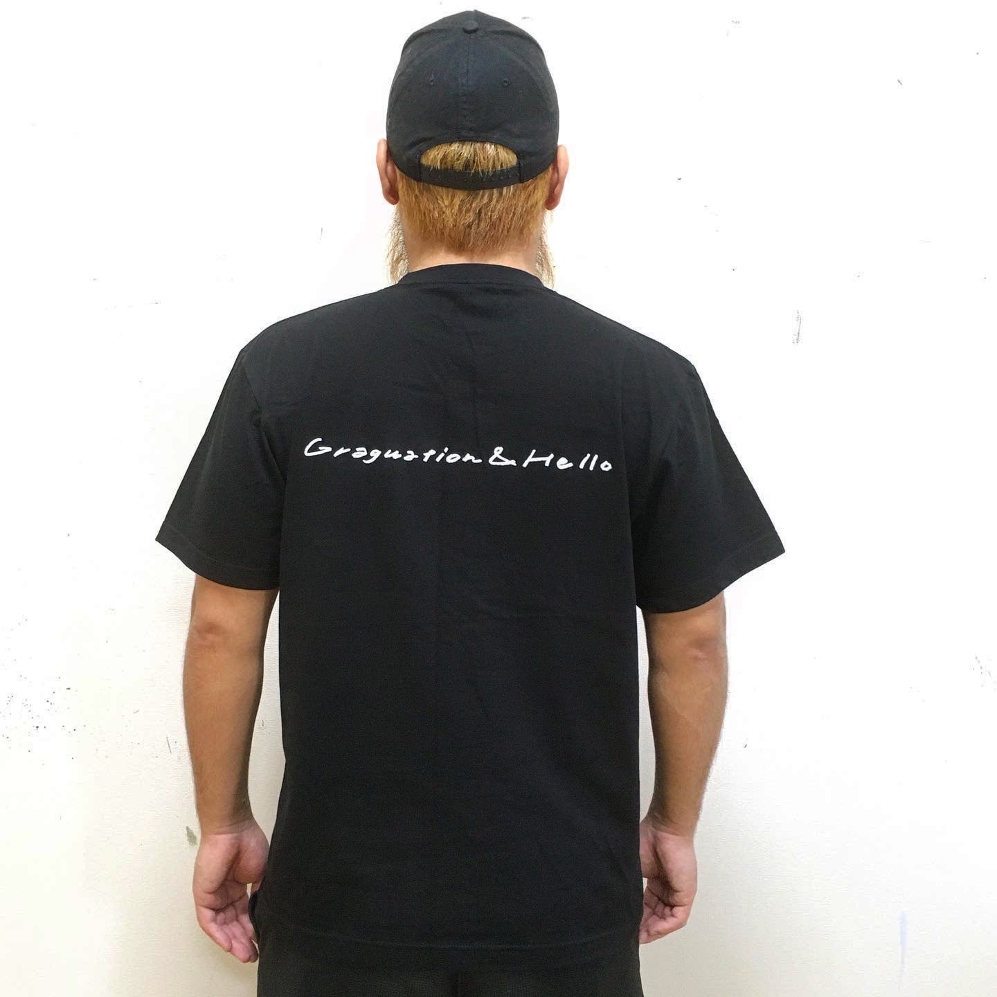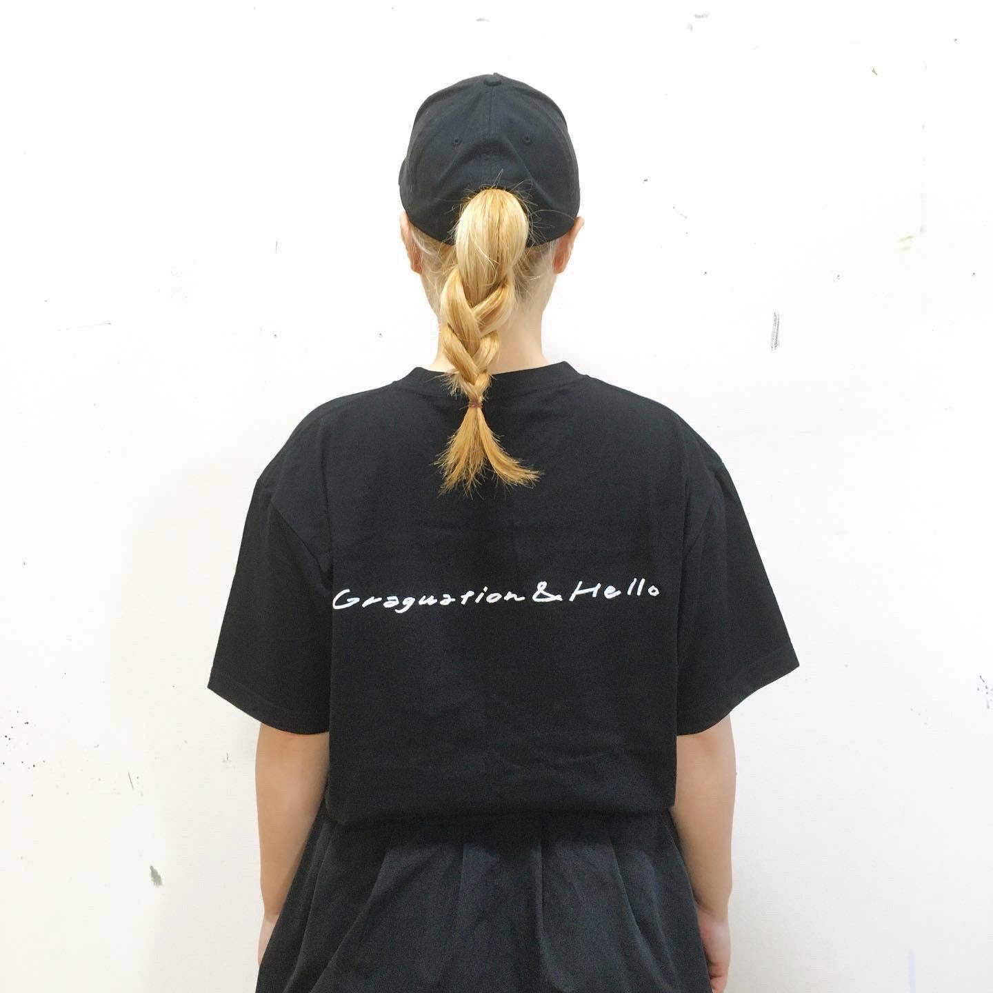 Tシャツ<タイプ2>は、FRONT・BACKともにプロジェクトのテーマである「GRADUATION and HELLO!」の直筆プリントのメッセージ入り。(BLACK BODY)