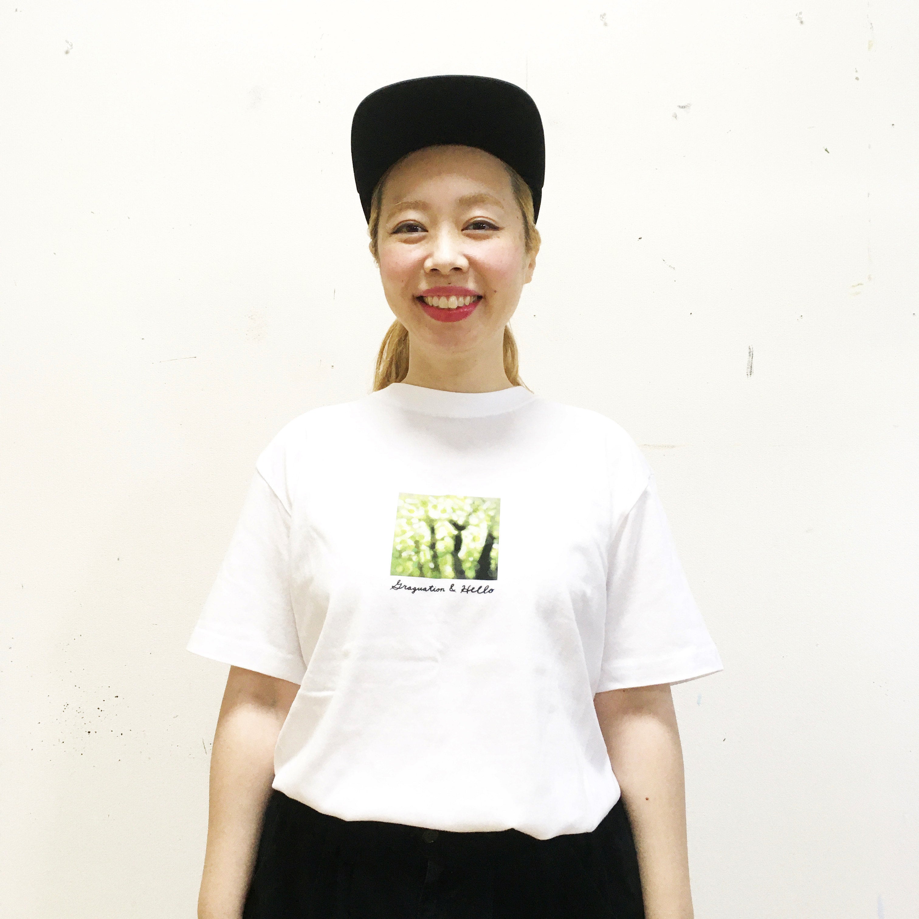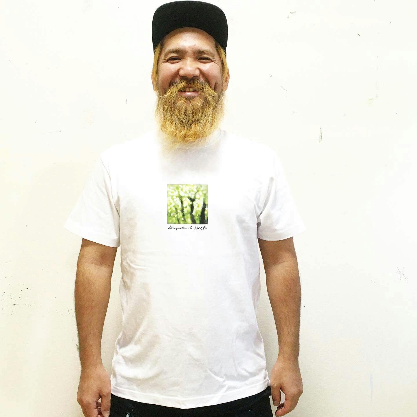 ●Tシャツ<タイプ1>は、FRONTには描き下ろし「木漏れ日・キミドリ」の絵画。BACKには、プロジェクトのテーマである「GRADUATION and HELLO!」の直筆プリントのメッセージ入り。(WHITE BODY)