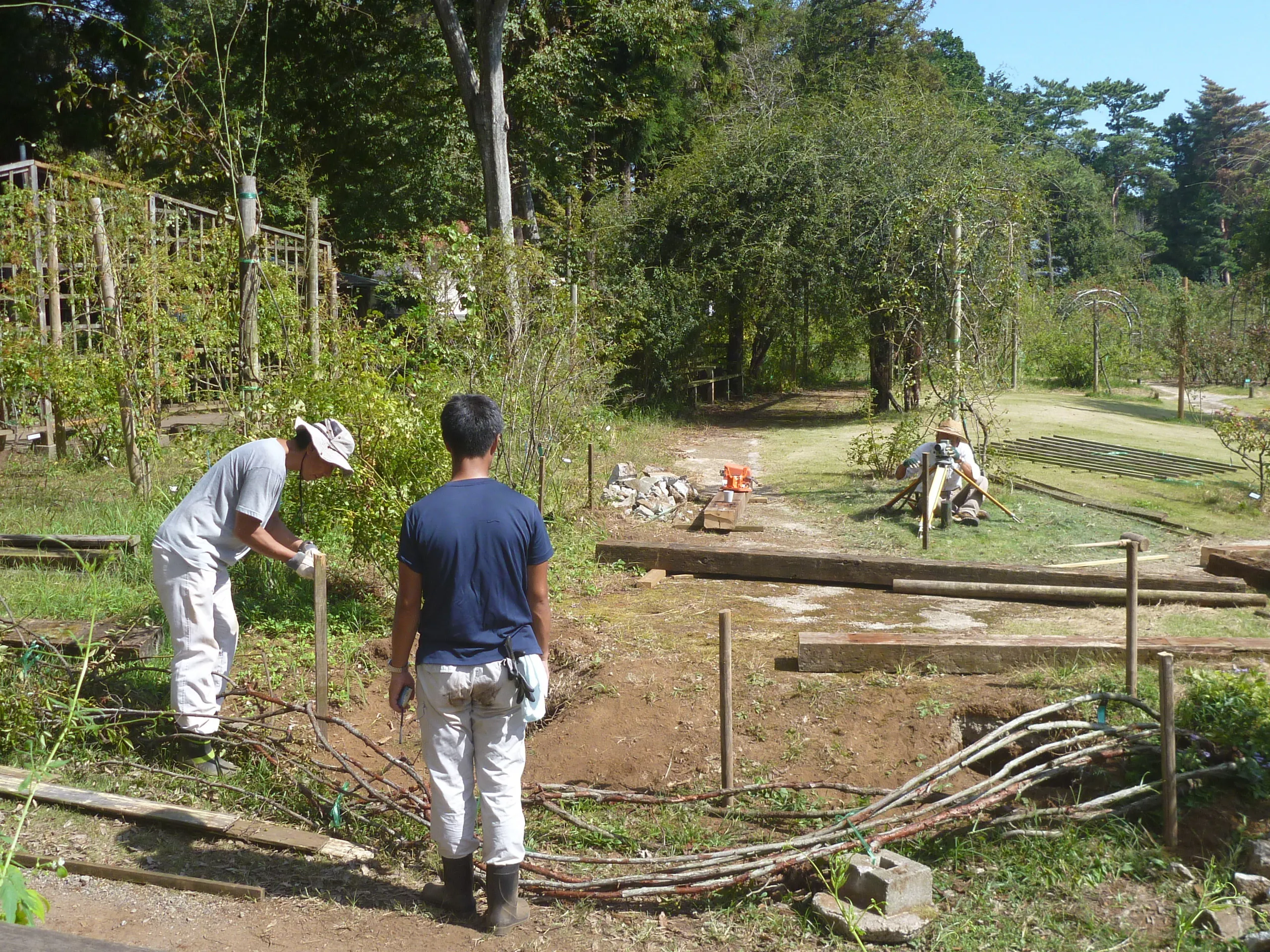 佐倉草ぶえの丘バラ園では、できるところから復旧作業を始めています。まずは、日本のバラコーナーで倒壊してしまったヤマイバラのパーゴラの再建。前原さんにお聞きしたところ新しいパーゴラは、家を建てるときと同じくらいちゃんとした基礎を打ってから建てるそうです。