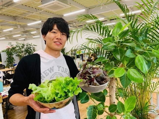 新富町の地域おこし協力隊、岩本くんもこゆ財団オフィスでキットを使った野菜栽培に挑戦中