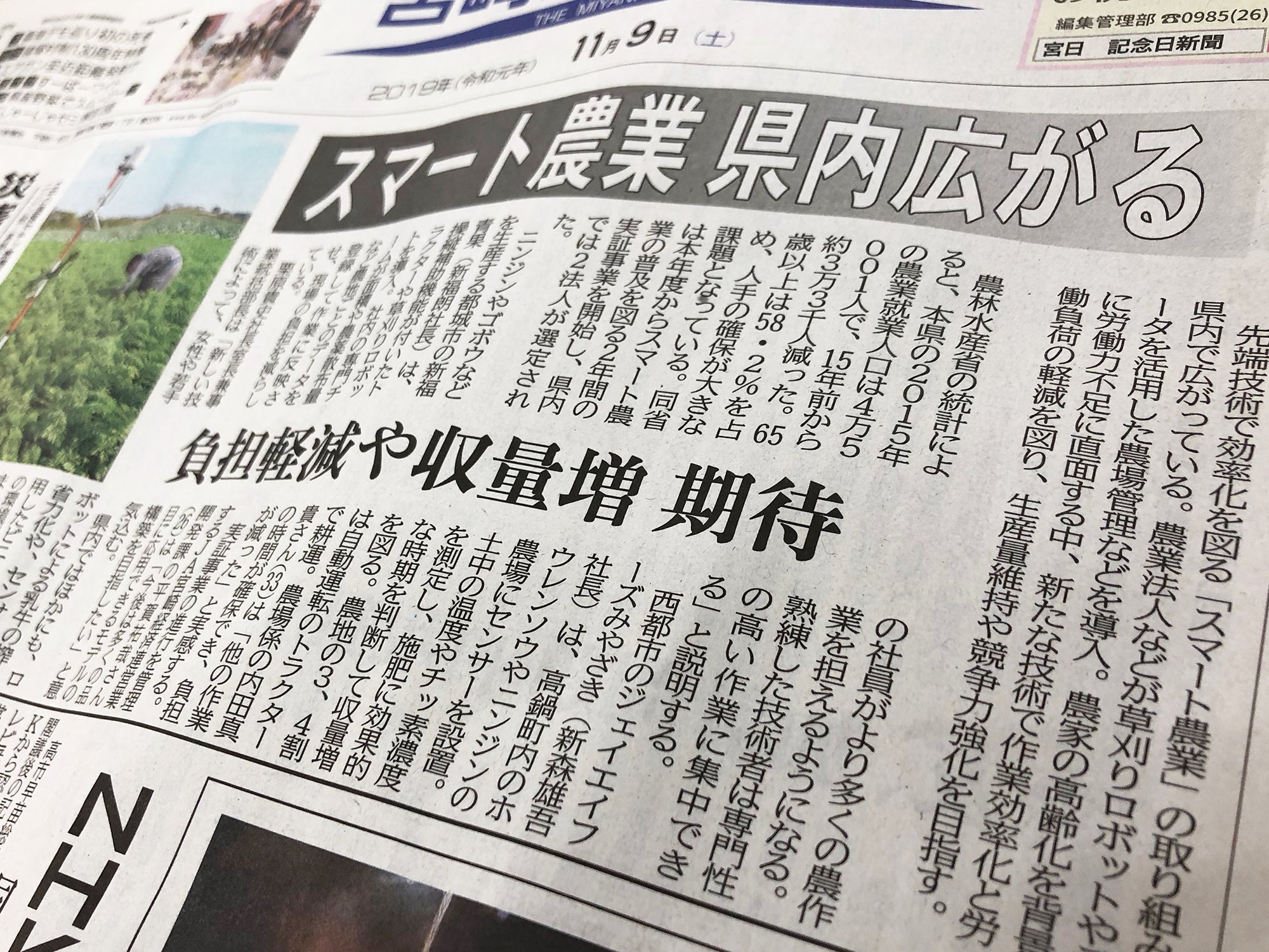 さらに地元の宮崎日日新聞でも、先日の1面には「スマート農業」の文字が!(同時に、2015年統計の宮崎県の農業就業人口が15年間で3万3,000人も減ったという深刻なデータも)