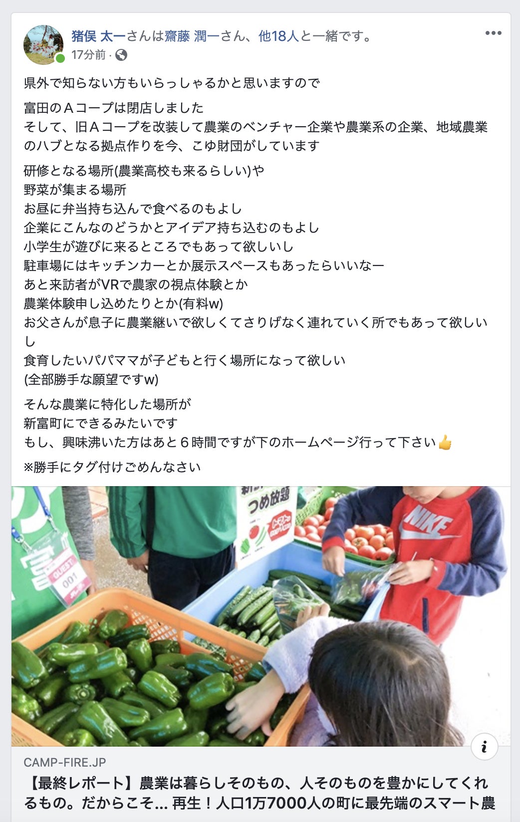 つい先ほど、新富町でスマート農業に取り組むキュウリ農家の猪俣太一くんが、レポート記事をFacebookでシェアしてくれました。