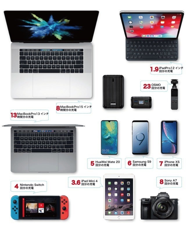 大容量27,000mAhのSuperTankは、出張や旅行など長期の外出でも存分に活躍します! 15インチMacbookProを1回(約8時間分)、もしくはiPhoneXSを7回、その他のデバイスやゲーム機など複数回充電することができます。(※自社調べ)