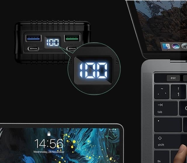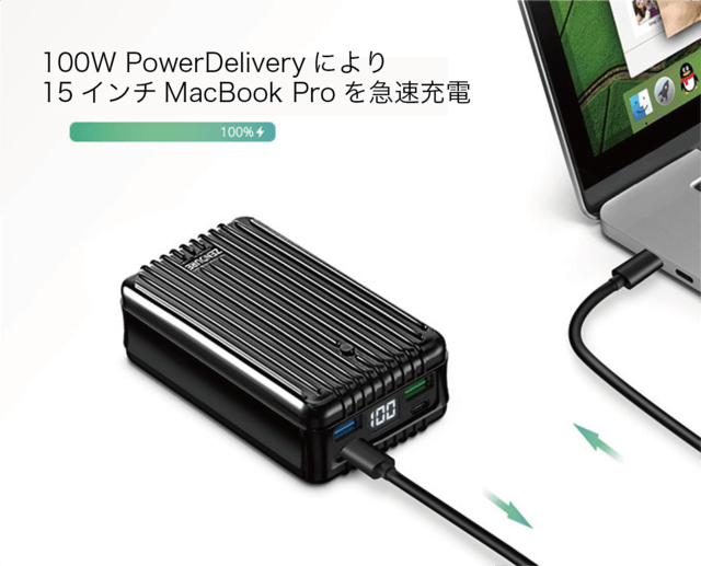 ポータブル充電器市場の多くの製品は、低USB-C電力出力(18/30/45 / 60W)と電力不足であり、15インチ MacBook Pro(87W)などの高USB-C出力を必要とするデバイスを充電する場合、予想よりも長い時間がかかってしまいます。 SuperTankは入力と出力の両方として機能できる単一ポートに最大100WのUSB-C電力供給を実現しています。 15インチMacBook Pro 2018を0%から100%(未使用時)に1.5時間ほどで充電ができます。(※自社調べ)