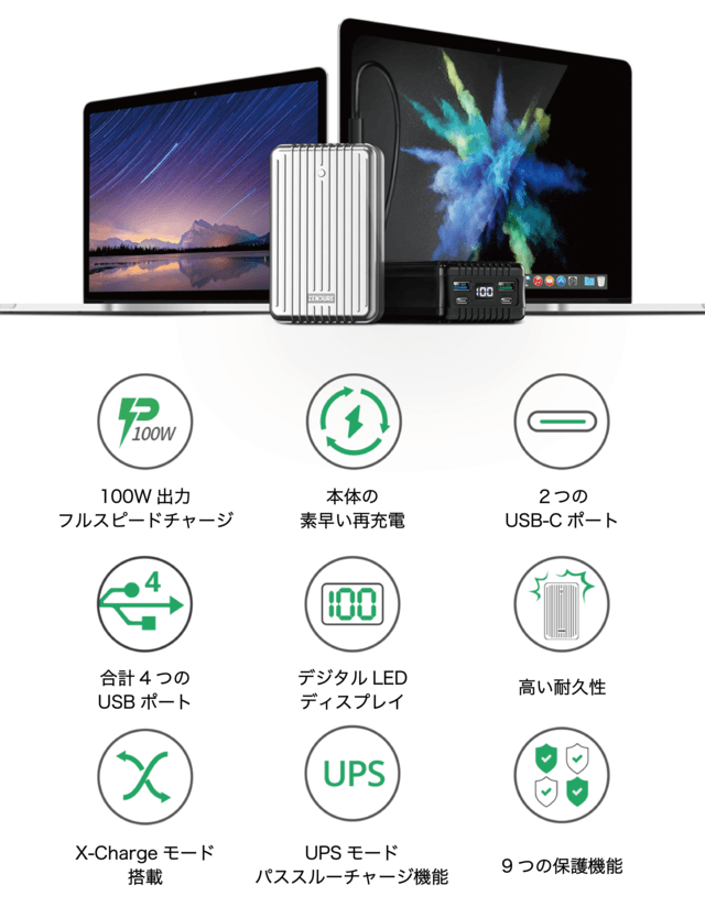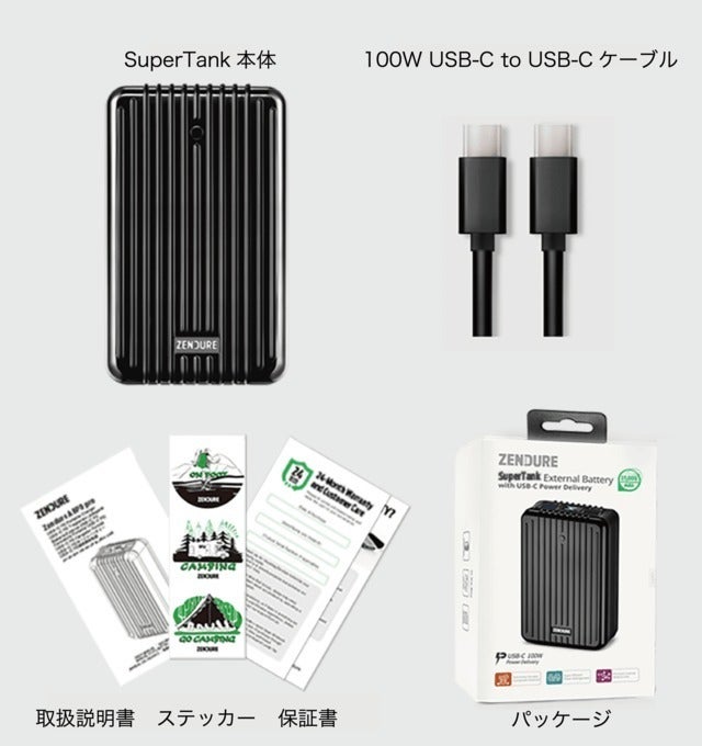 SuperTank本体は、Power Deliveryを介し最大100Wで充電することにより素早く充電することができます。 Power Deliveryによる高速充電を有効にするには、十分な電力(100W以上)を供給できる電源コンセントと、5A対応のUSB-Cケーブル(付属ケーブル)が必要です。