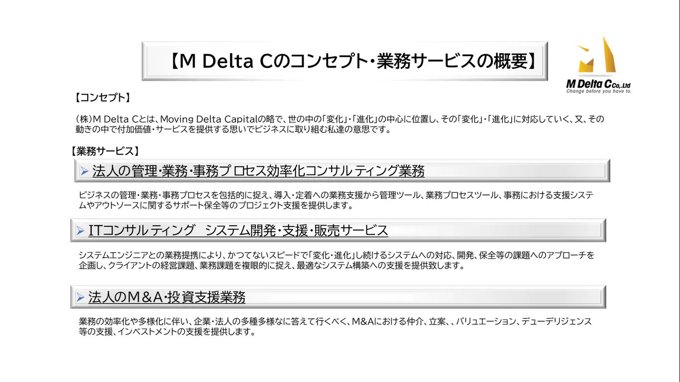 はじめまして、私たちは株式会社M Delta Cと申します。