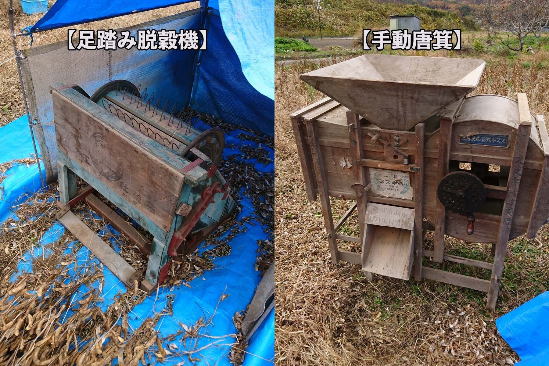 黒豆・赤大豆は、農薬、肥料、除草剤を使わずに丁寧に種まきや草取りを行い、土寄せや摘芯を行い実がしっかりとなるように栽培しています。更に、足踏み脱穀機や手動唐箕(とうみ)で、昔ながらの手間の掛かる丁寧な選別を行い、豆本来の風味がある納豆になるように工夫しています。