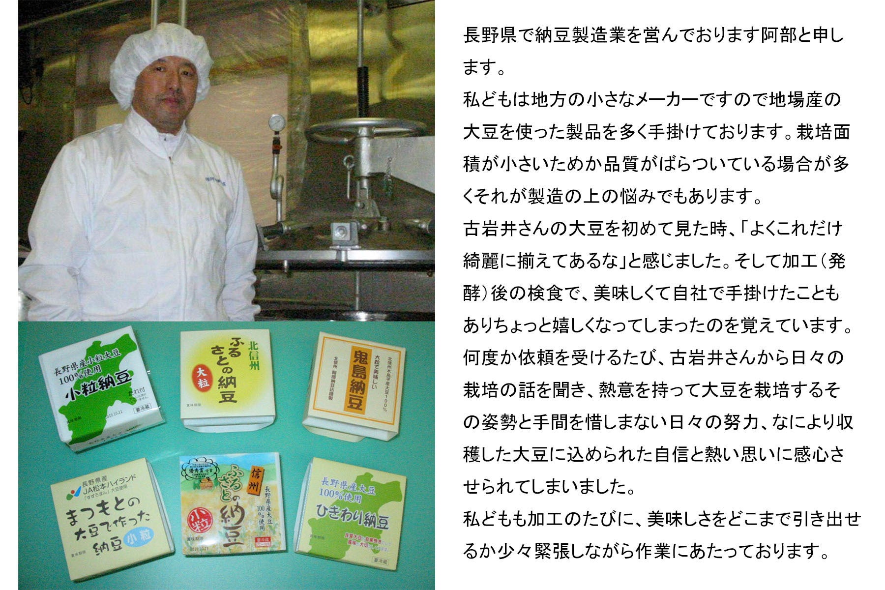 日頃、私の黒豆・赤大豆を手前納豆にしてくれる阿部納豆さんからもコメントを頂きましたので、ご紹介させて頂きます。