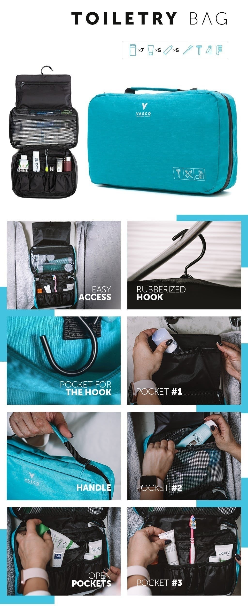 バッグ内にあるフックを使用すると小さなバスルームでもパーソナルケア製品を置くスペースを確保できます。