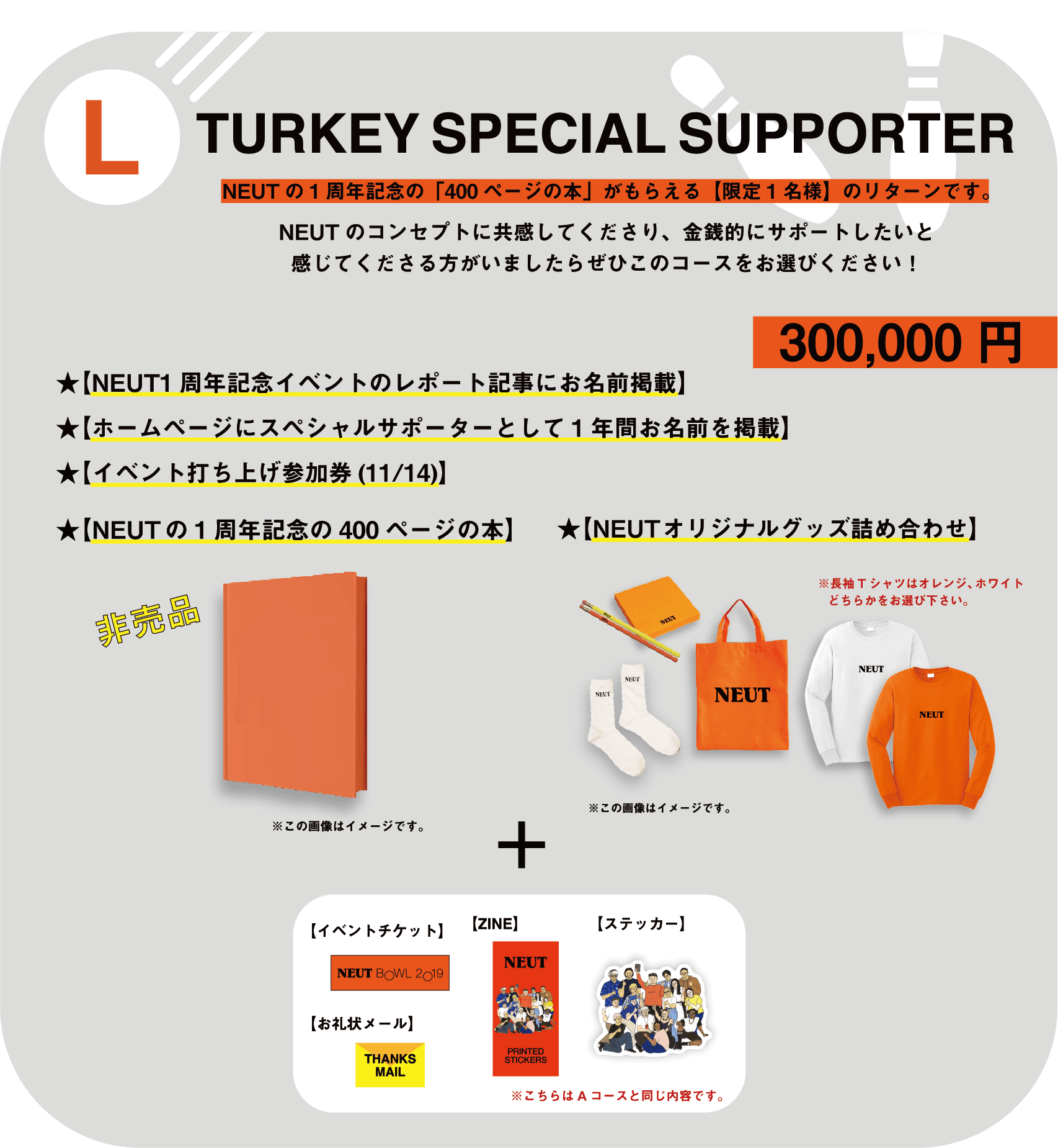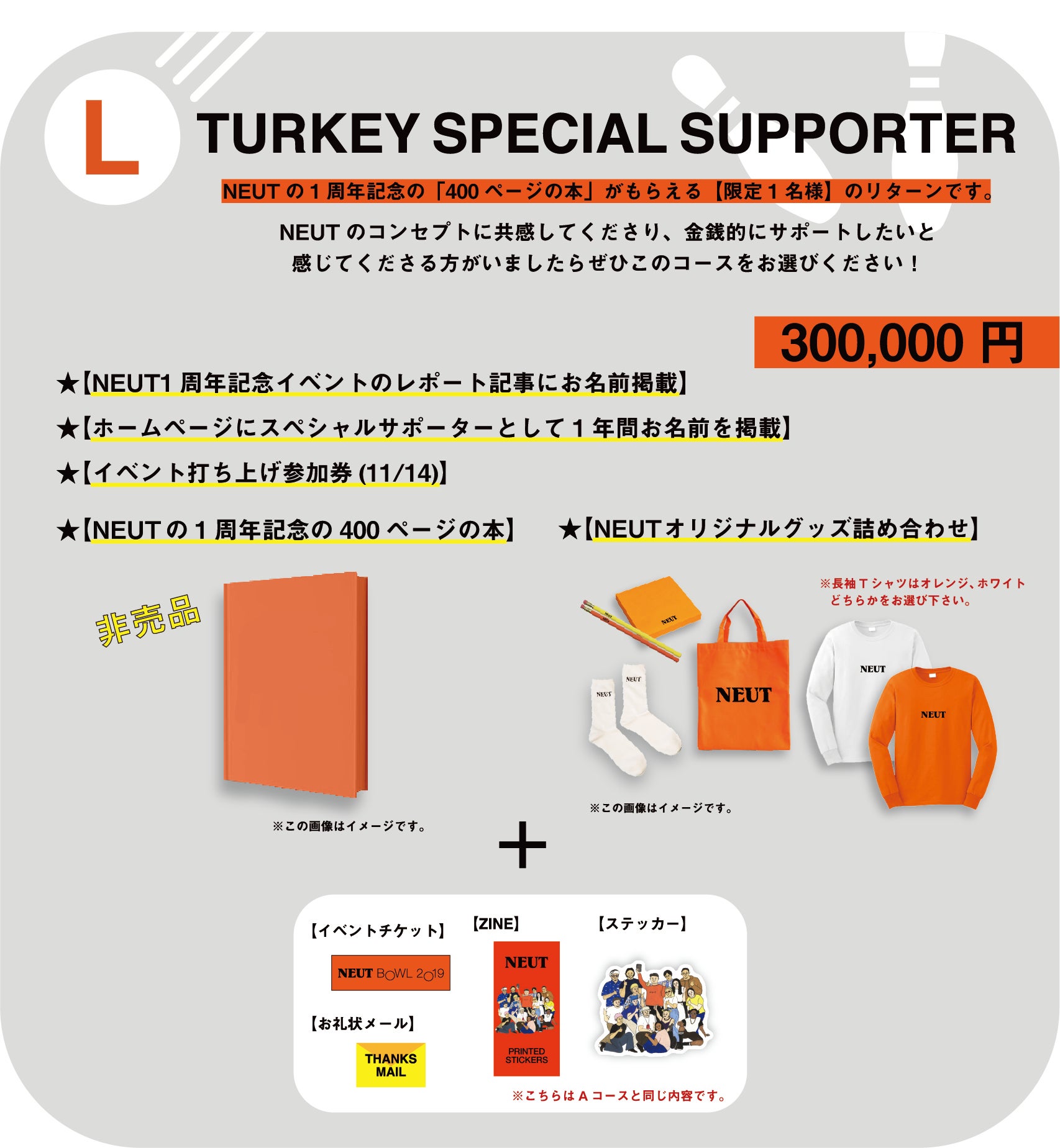 リターン:NEUT1周年記念のために制作した400ページの本、NEUT編集部やイベントに関わったメンバーが参加する神泉にあるレストラン「Sta.」での打ち上げに参加(11月14日)、ホームページにスペシャルサポーターとして1年間お名前を掲載、イベントレポート記事にお名前を掲載、オリジナルグッズ詰め合わせ(鉛筆、メモパッド《クラウドファンディング限定グッズ》、トート、靴下、長袖Tシャツ《クラウドファンディング限定カラーあり》)、1周年記念イベントチケット、1周年特集限定ZINE、1周年記念ステッカー。