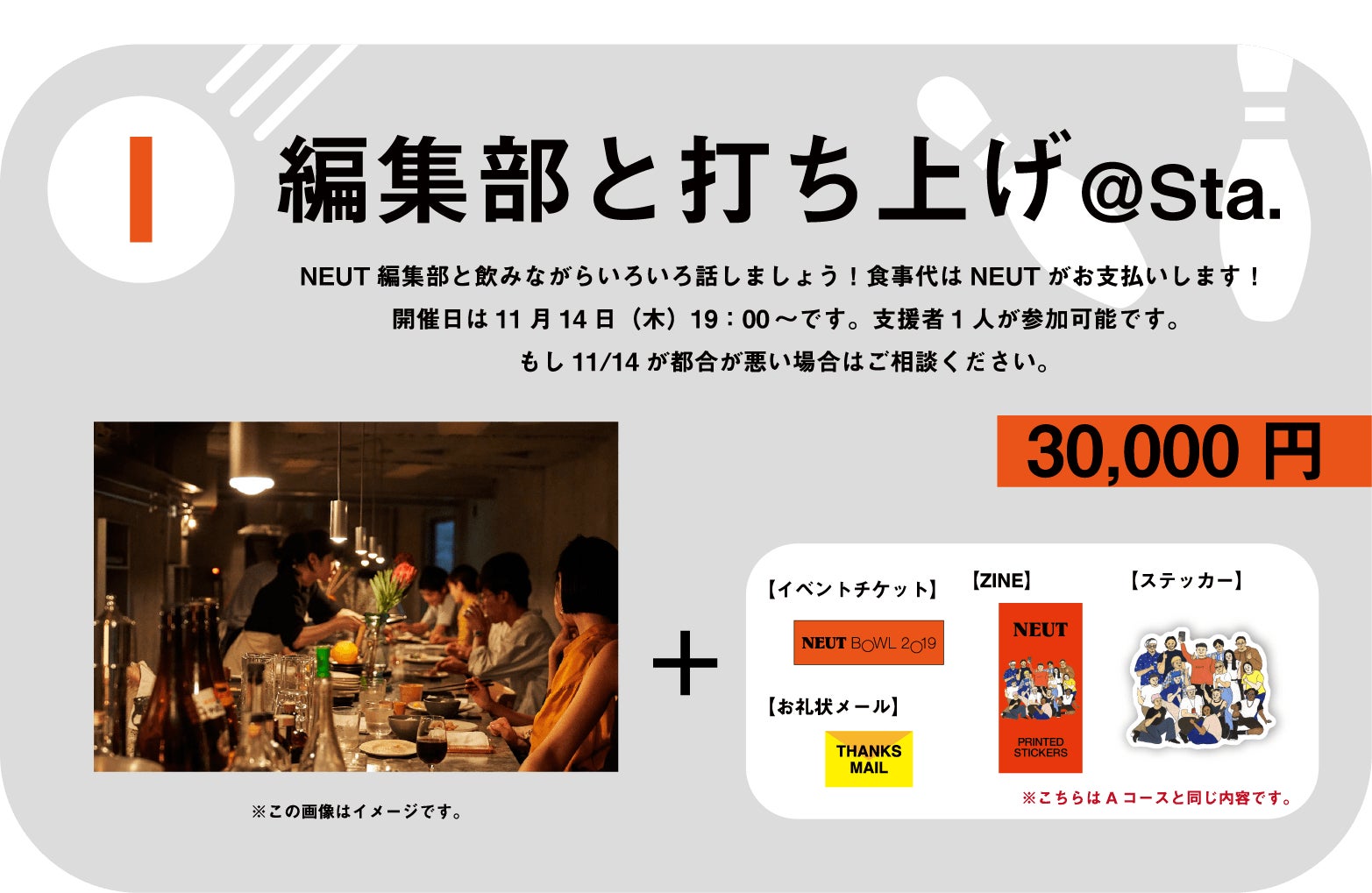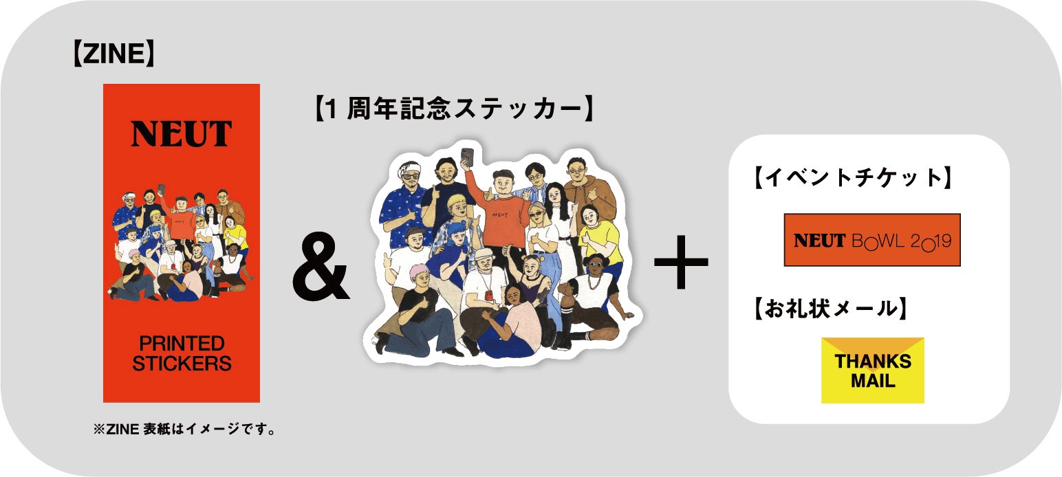 リターン:NEUT編集部やイベントに関わったメンバーが参加する神泉にあるレストラン「Sta.」での打ち上げに参加(11月14日)、1周年記念イベントチケット、1周年特集限定ZINE、1周年記念ステッカー