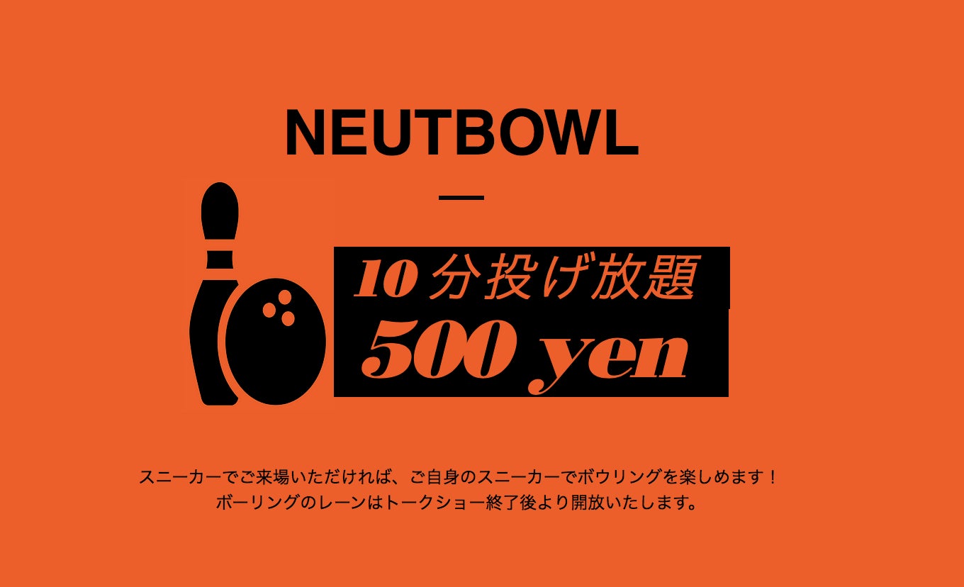 トークセッション(20:40)以降は、いつでもボウリングができるので、みんなでボウリングを楽しみましょう!!今回は笹塚ボウルによるNEUTスペシャルプランで【10分投げ放題500円/シューズレンタル無料】となりました!スニーカーを履いて来場した方はご自身の靴でそのままボウリングをすることが可能ですので、お気に入りのスニーカーをぜひ履いてきてください!