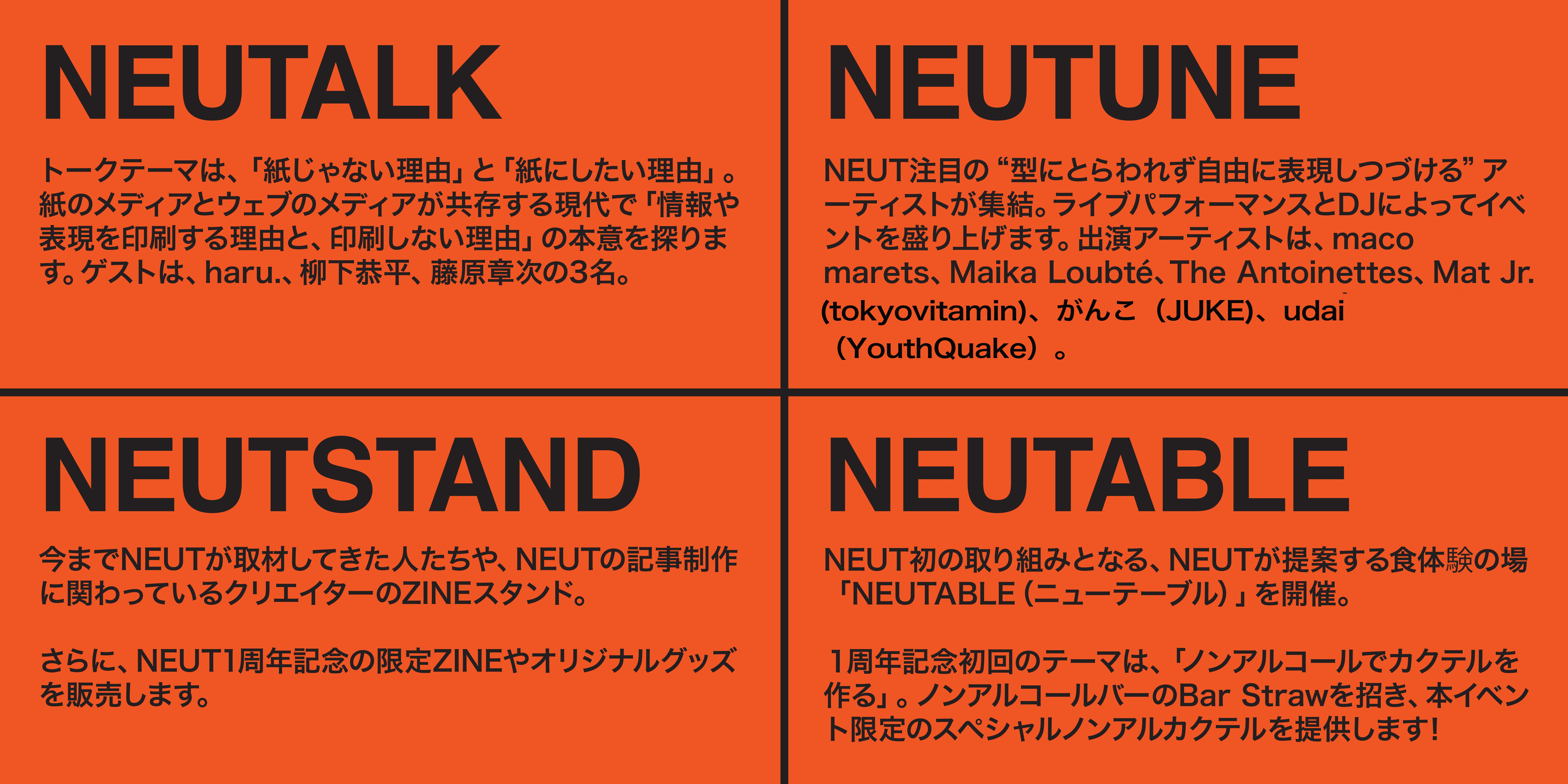 本イベントは、トークセッション「NEUTALK(ニュートーク)」、ライブ&DJ「NEUTUNE(ニューチューン)」、グッズ&ZINEの販売「NEUTSTAND(ニュートスタンド)」、そしてノンアル&アルコールドリンクスタンド「NEUTABLE(ニューテーブル)」で構成されます。