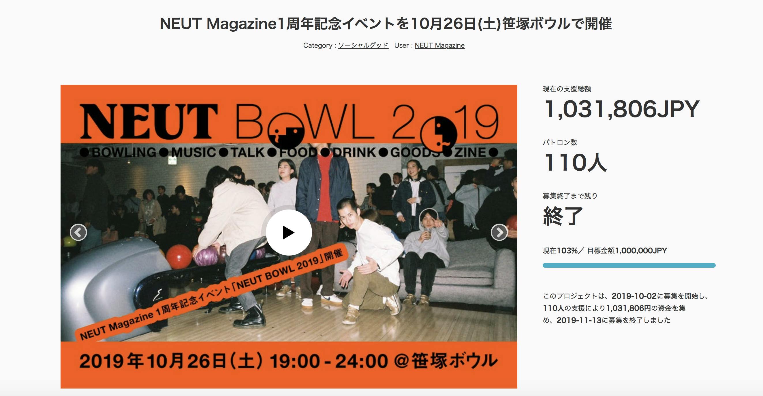 今回のプロジェクトは、昨年の創刊時に開催し、500名以上が来場した笹塚ボウル(笹塚にあるボウリング場)でのイベント「NEUT BOWL(ニュートボウル)」を、今年も1周年記念イベントとして【無料】で開催する資金を集めるために立ち上げました!
