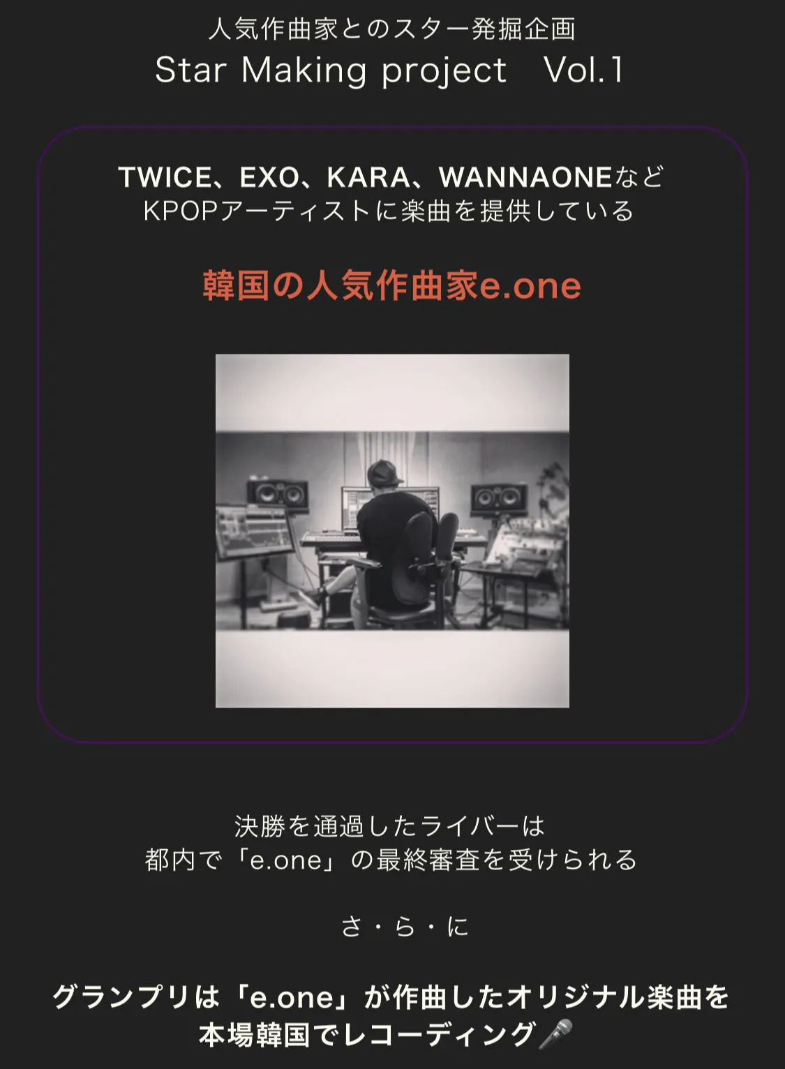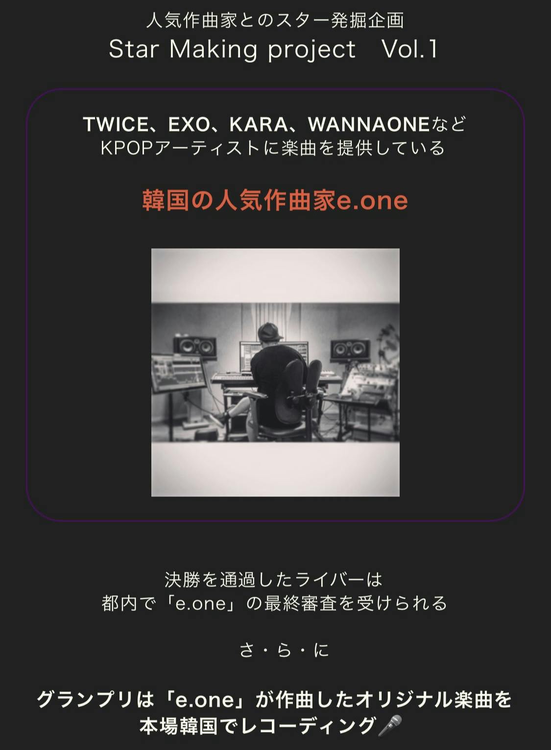 Mixchannelの楽曲提供オーディションでe.oneさんに選んで頂き、グランプリになり、今年の3月頃に韓国でレコーディングをしてきました。