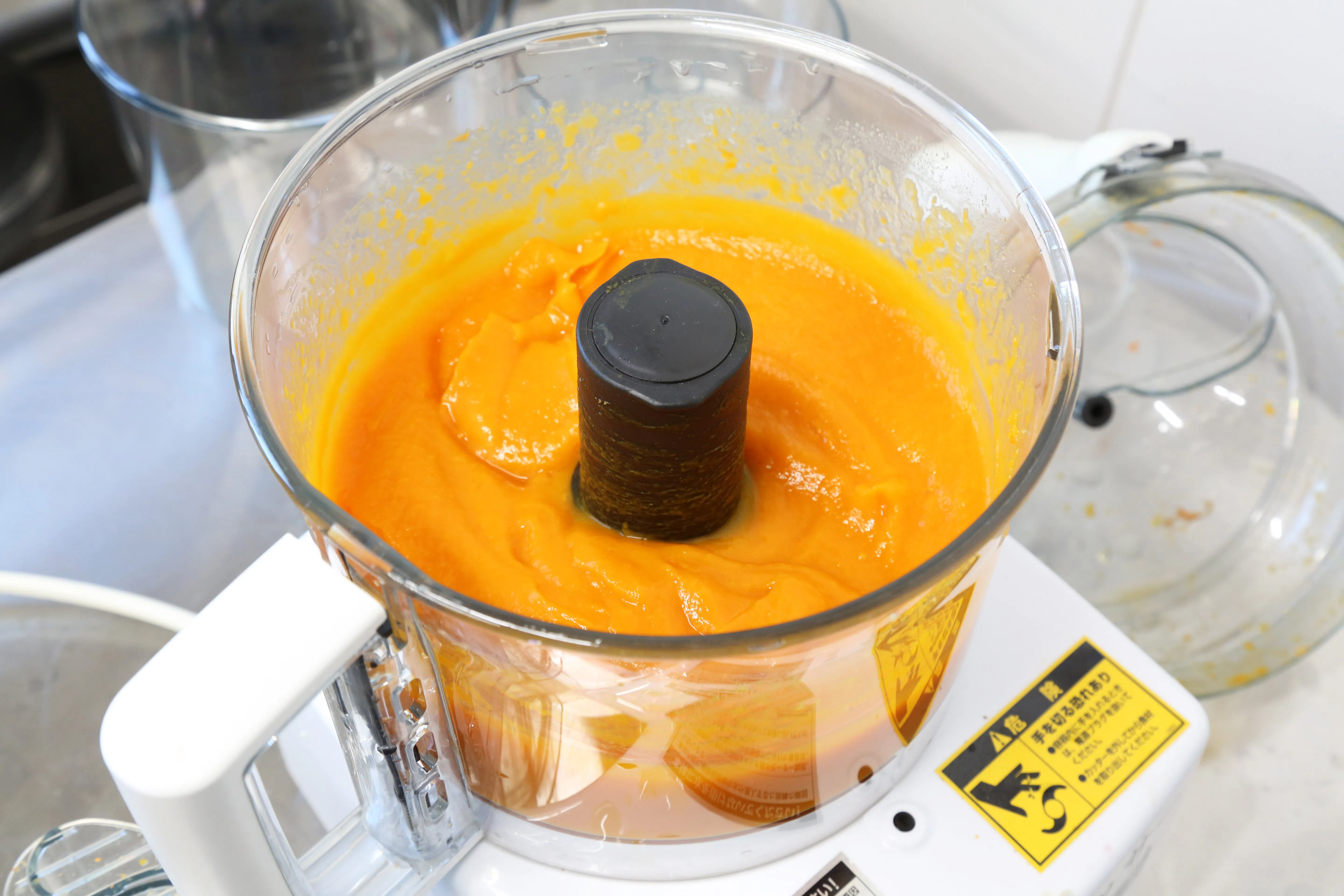 このかぼちゃは生の状態でも食べれるのですが、スチームコンベンションで蒸すことで甘みが倍増して、かぼちゃのみでものすごい甘いピュレになります。