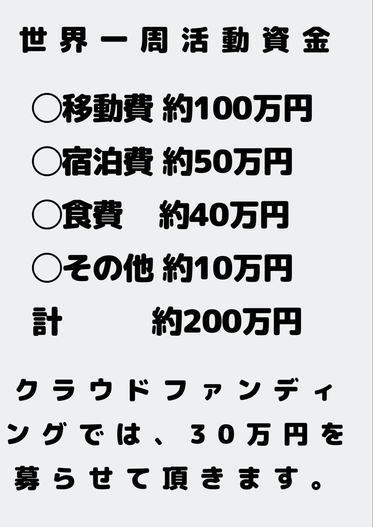 ※もしこの金額以上支援(手数料+消費税を差し引いて残った分が30万円を超えた場合)を頂いた場合は、世界一周教育の旅の活動資金、講演会の資金やリターンの資金にさせて頂きます。