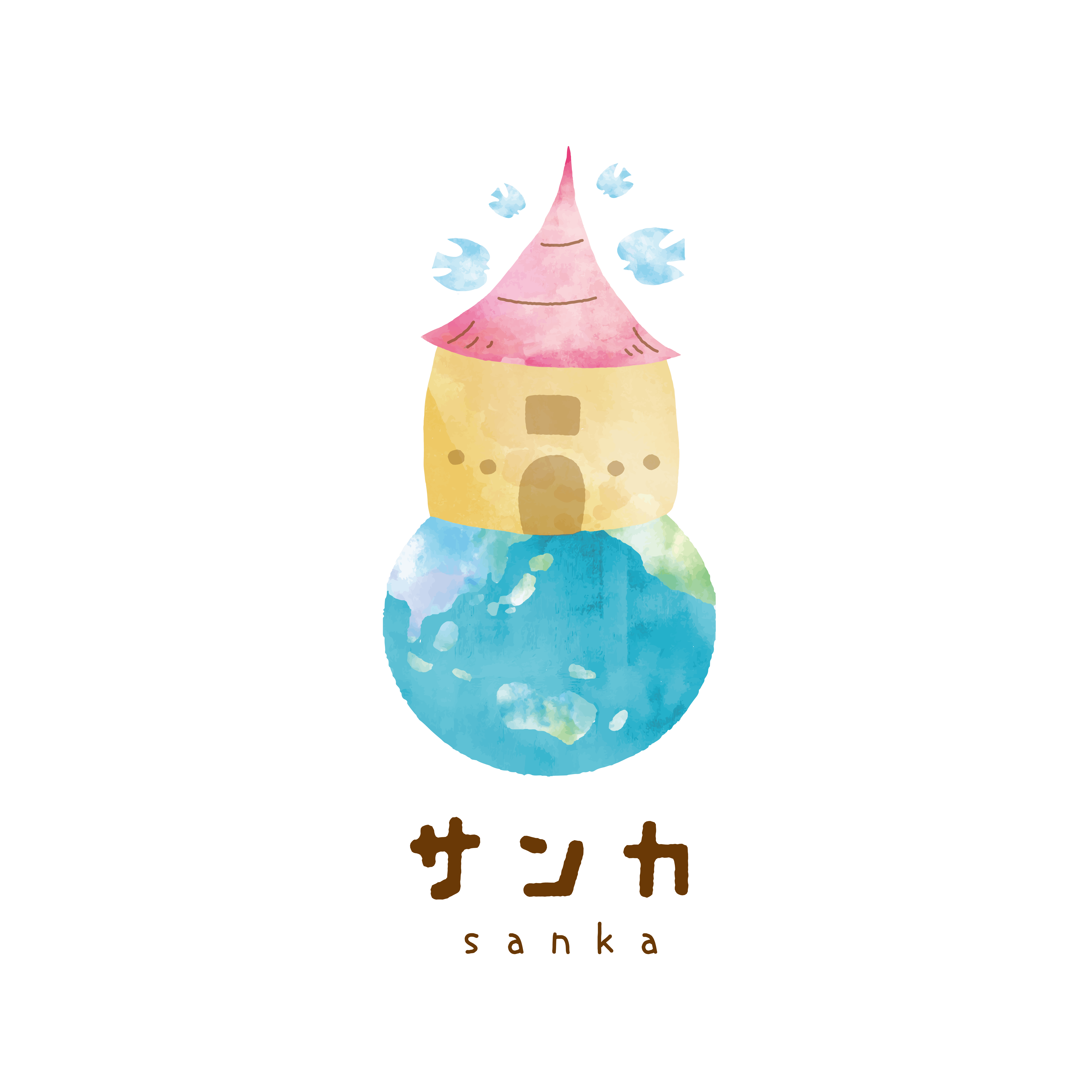 サンカという言葉には丸くて村のように小さな人々が協力してゆく社会をイメージし、ロゴにはたくさんの人(鳥)が集まる村の中の家をイメージしています。